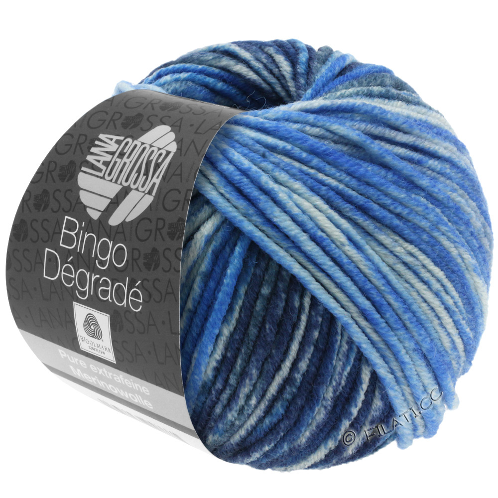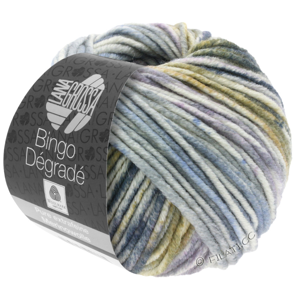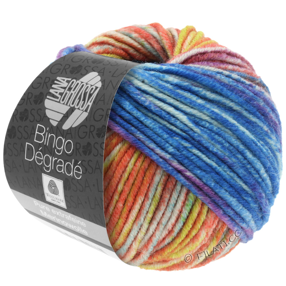 Klassiskt garn i 100 % ren, ny extrafin merinoull som kan tvättas i maskin, tovar inte. Bingo Dégradé har graderade färgövergångar, men garnet finns också i enfärgat (Bingo UNI), melerat (Bingo Mélange) och med tryck (Bingo Print & Bingo Funky Print). Passar bra till: halsdukar, tröjor, västar, etc. Material från Australien (merino). Tillverkat i Italien.
