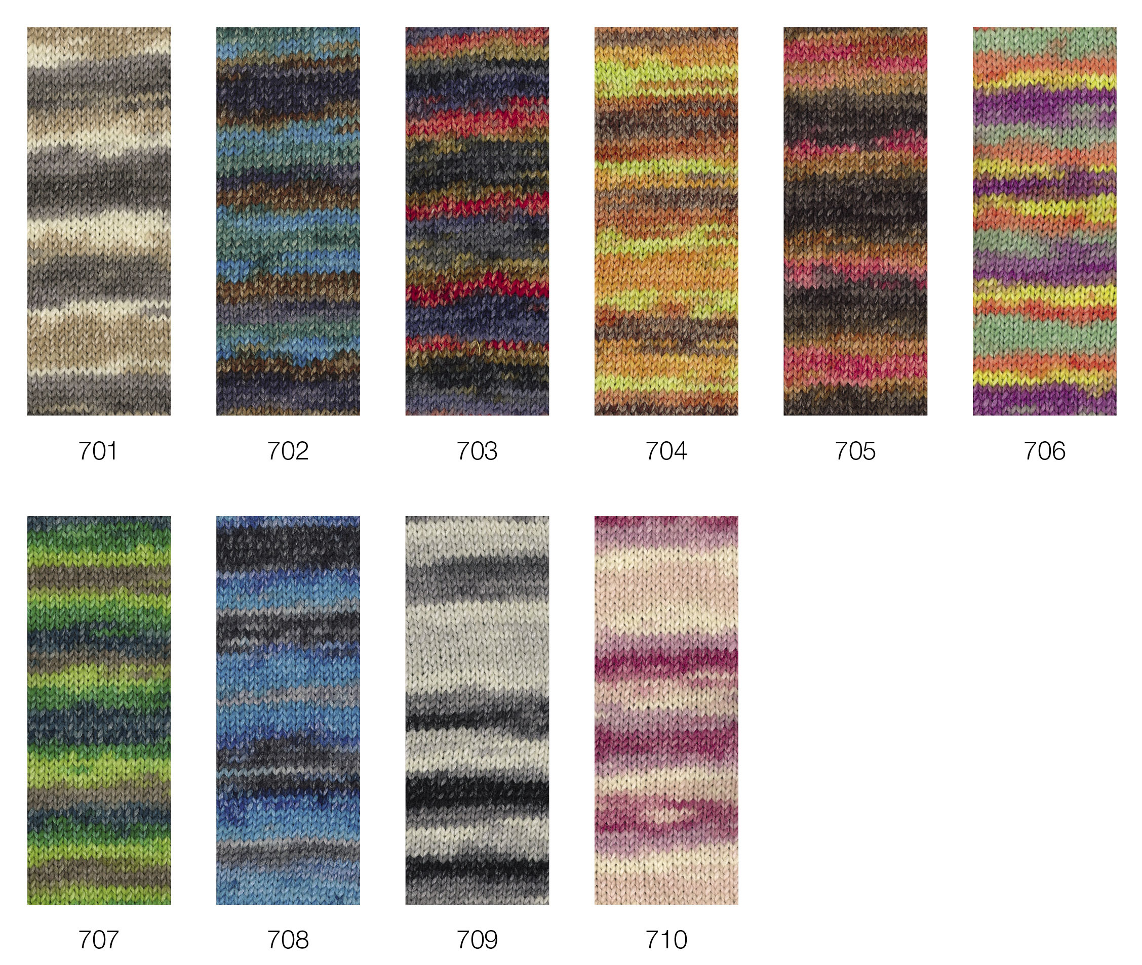 Löst tvinnat 1-trådigt garn i 70 % ren, ny merinoull med 10% silke och 20% viskos. Gomitolo Conseta har kortare tryckta färgövergångar med matt-glans effekt.