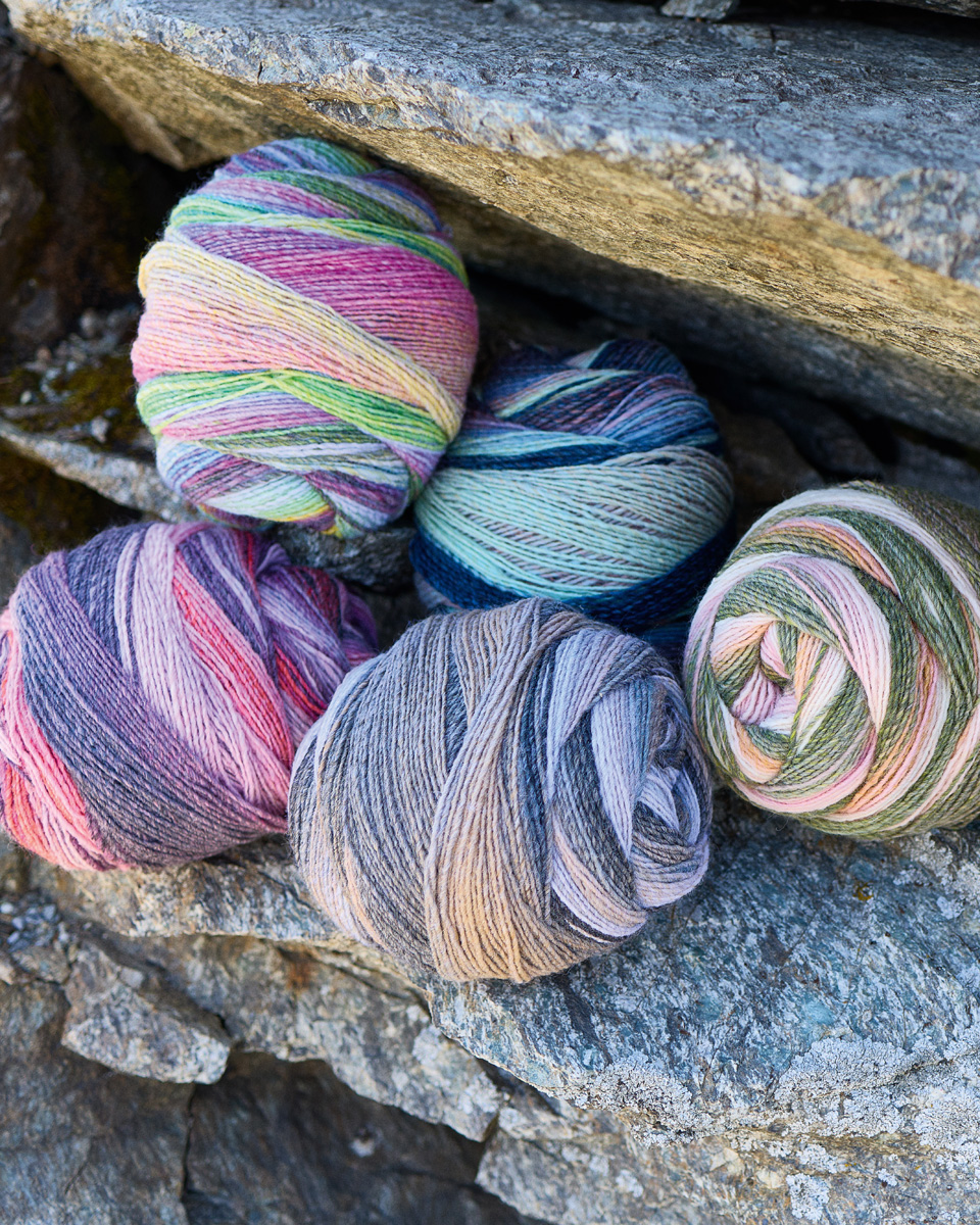 Löst spunnet garn med regelbunden färgövergång i breda ränder.