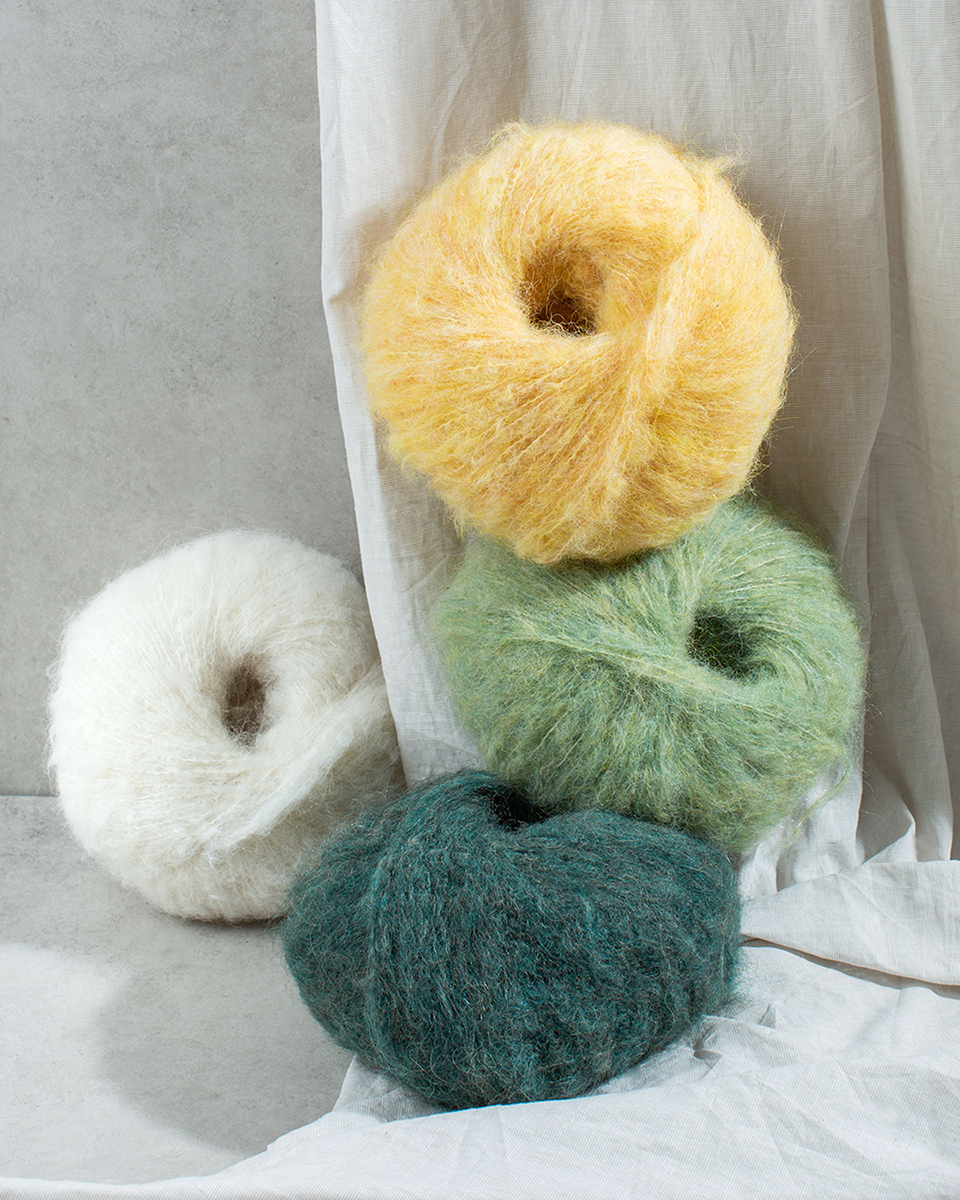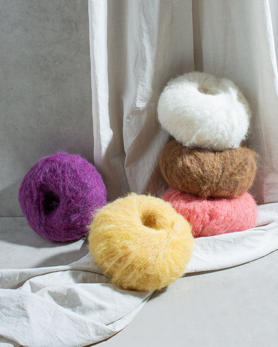 70 % Mohair, 20 % Ren, ny merinoull, 10 % Polyamid