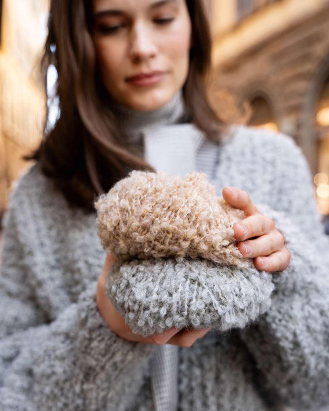 Mjukt bouclégarn spunnet av en blandning av alpacka och merinoull.