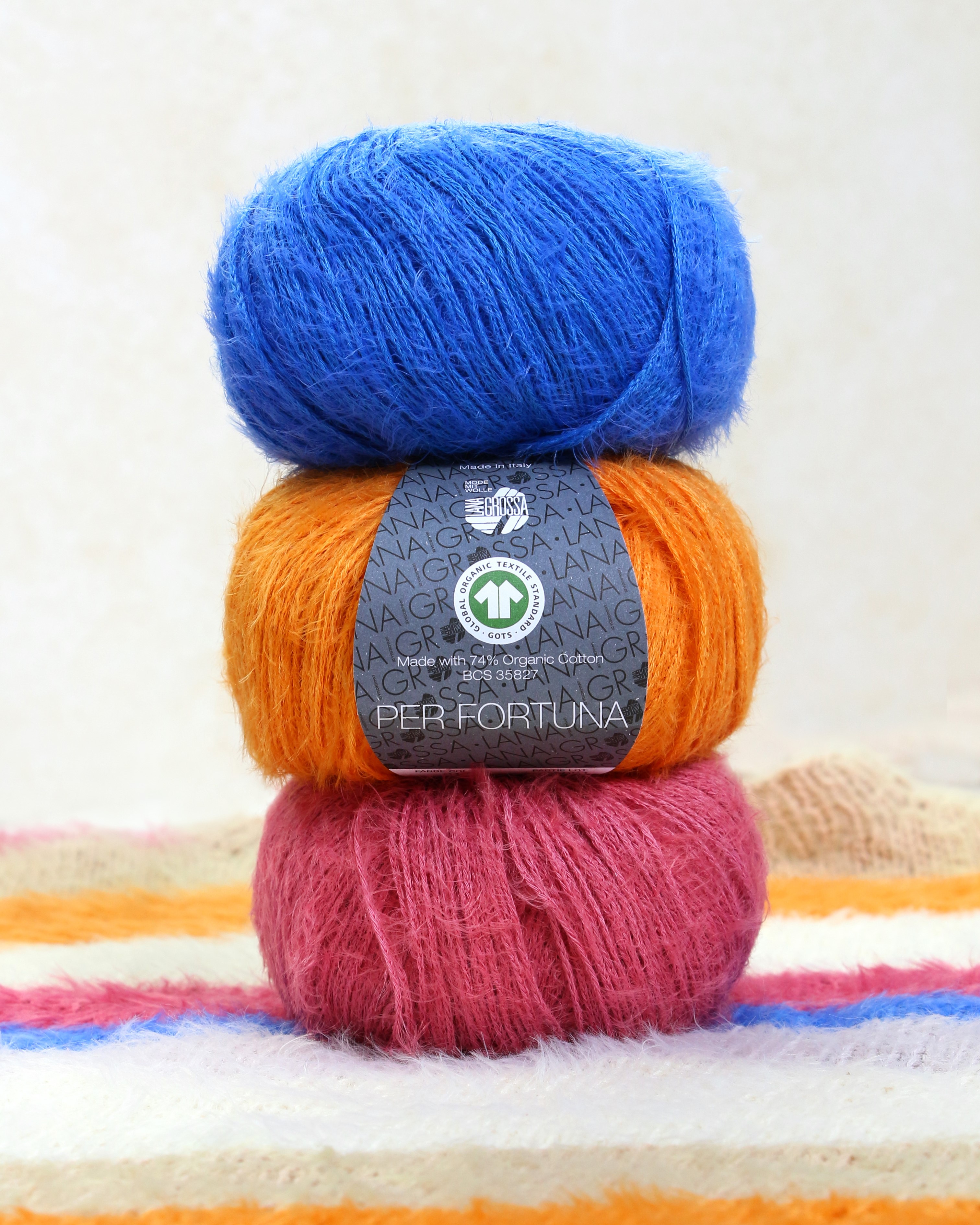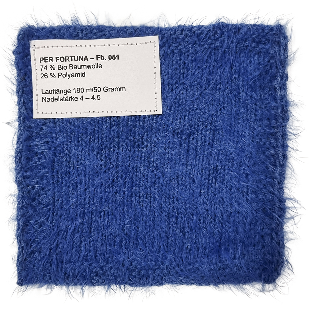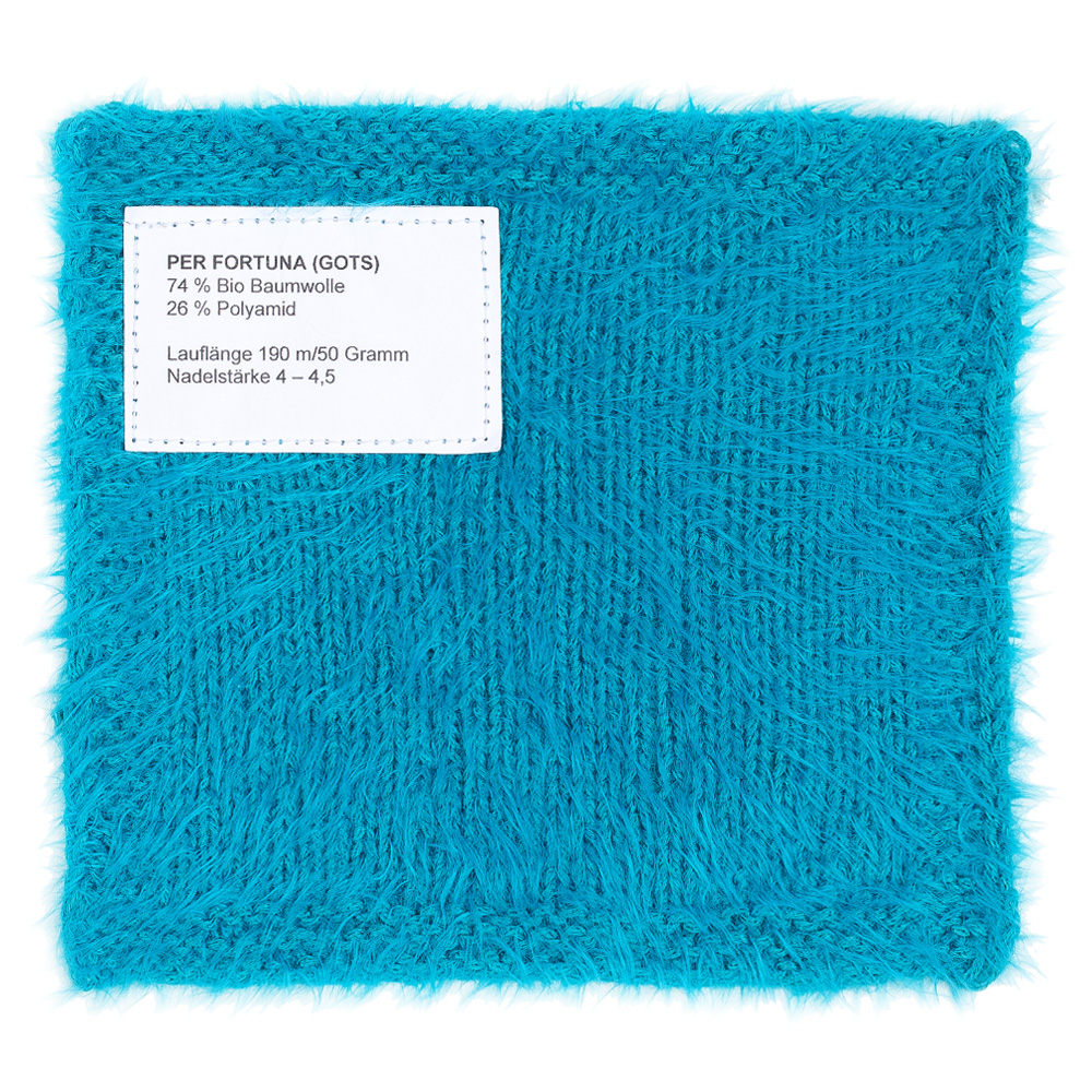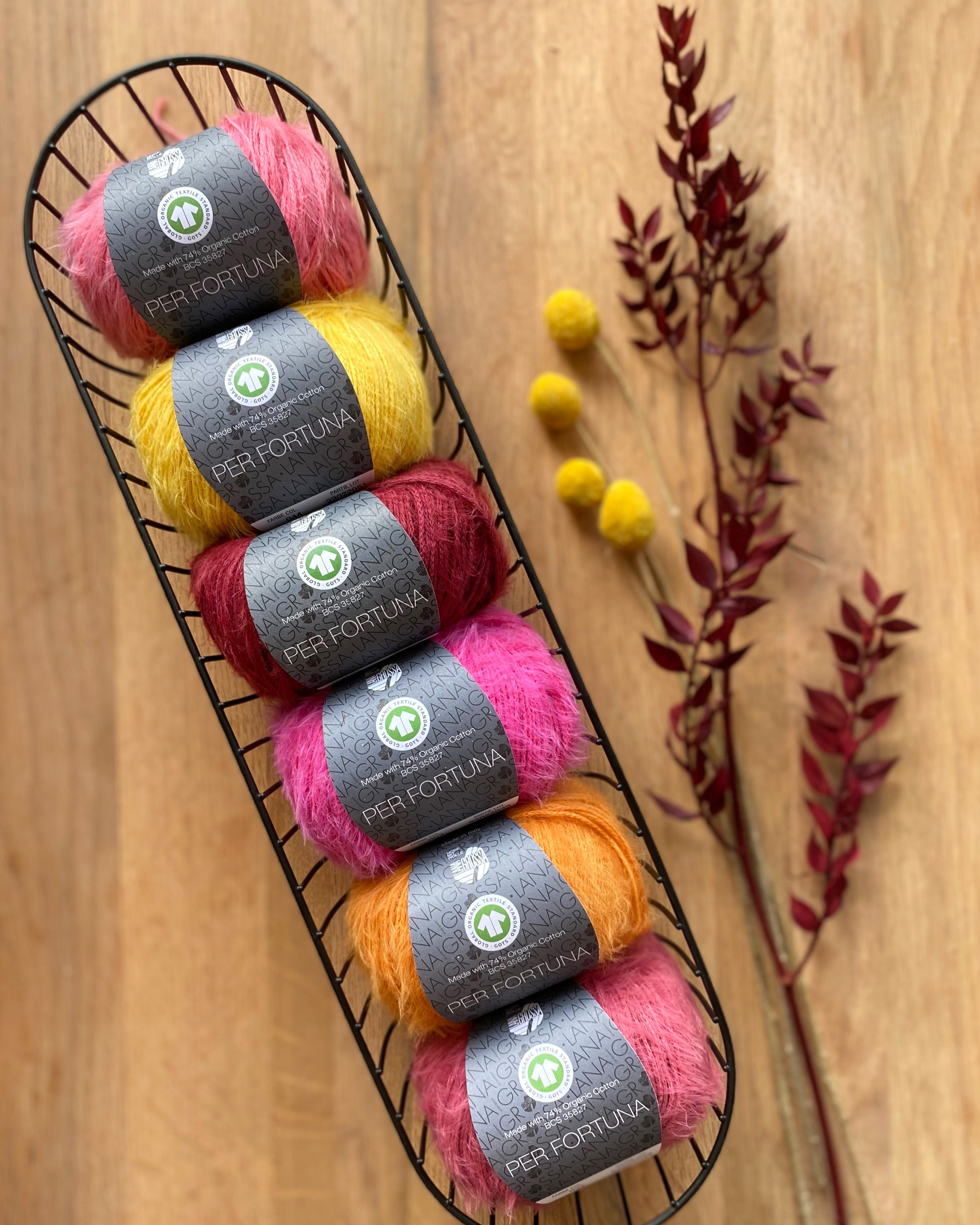 Per Fortuna är ett hållbart kedjegarn med mjuk, fluffig känsla och särskilt behaglig yta. Det är tillverkat av ekologisk bomull och återvunnet polyamid och är GOTS-certifierat – perfekt för alla som vill sticka miljömedvetet utan att kompromissa med komfort.