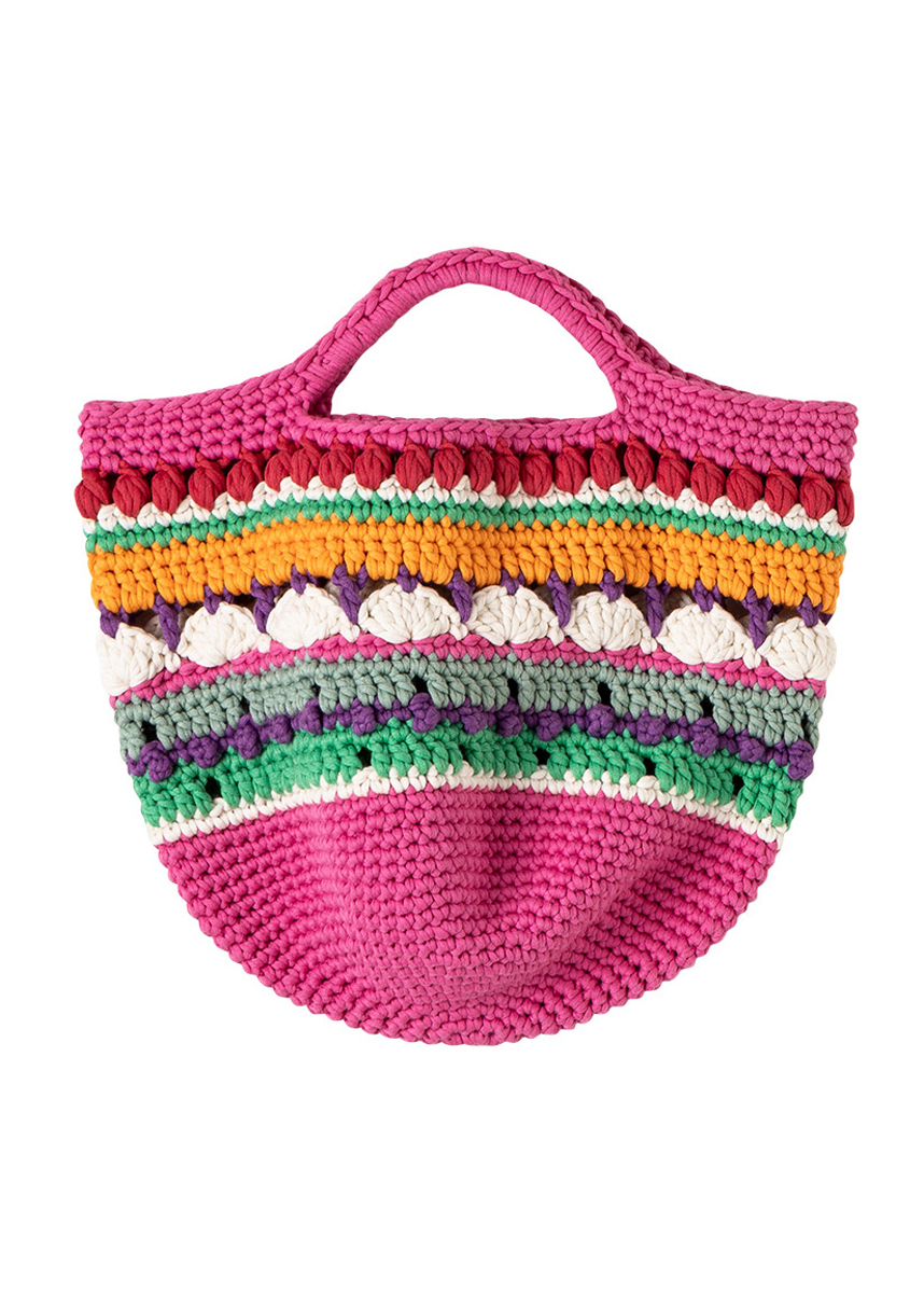 Lana Grossa-kvalitet ”Promessa” (70 % (bio) bomuld, 30 % rec. polyamid, løbelængde = ca. 125 m / 50 gr): ca. 100 gr pink (fv 2) og mintgrøn (fv 16), 50 gr orange (fv 4), smaragd (fv 9), creme (fv 14), orientrød (fv 1) og violet (fv 8), hæklenål nr. 5. Bemærk: Modellerne hækles med dobbelt garn. Er der kun 1 garn- nøgle til rådighed i en farve, tages enderne både udefra og indefra nøglet. Der er garn nok til begge tasker i den angivne mængde. Taskerne hækles i det samme mønster, men i forskellig farvefølge.