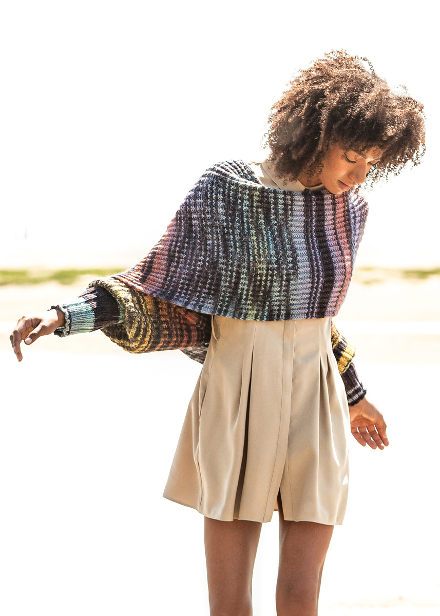 Lana Grossa Gomitolo Bene (60% ren ny ull merino, 40% polyacryl, løpelengde 700 m/200 g), 400 (600) g laks/svartbrun/gul/khaki/gråblå (farge 751); 1 rundpinne nr. 5, 80 cm lang og settpinner nr. 4,5.