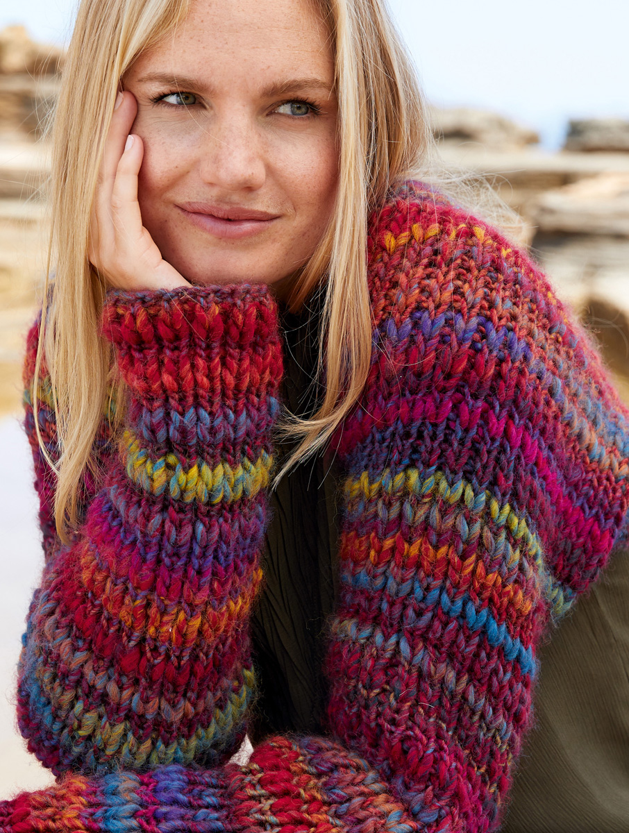Lana Grossa Olympia Classic (53 % virginull, 47 % polyacryl, löplängd = ca. 100 m/100 g): ca. 400 (500 – 500) g petrol/burgund/mörk röd/terrakotta/royal/vinröd (färg 62); stickor Nr. 8