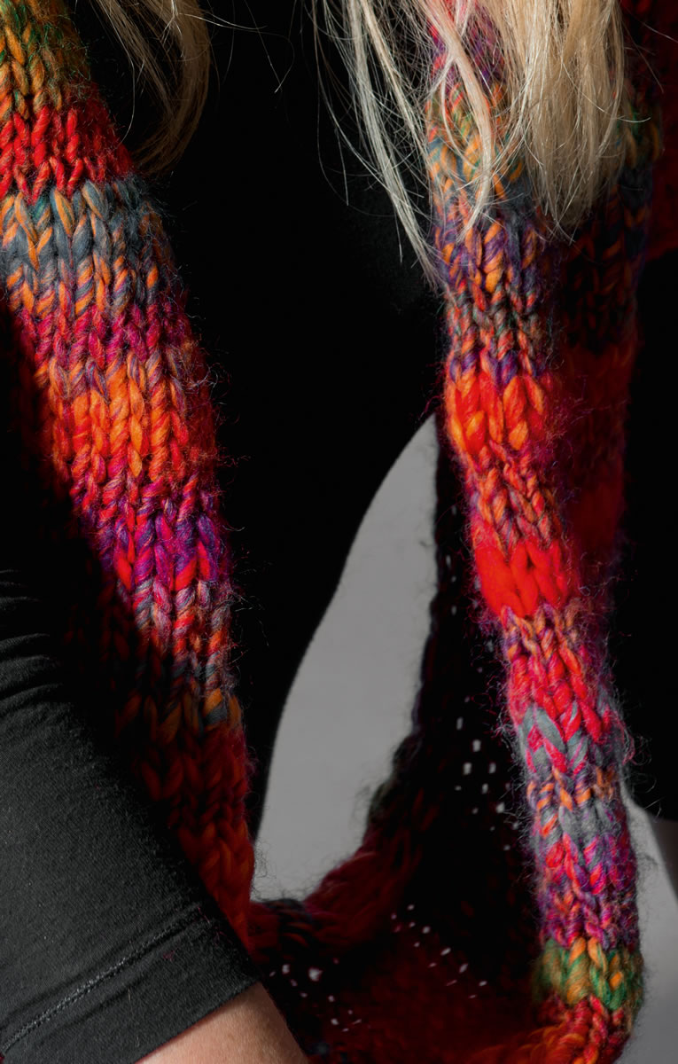 Lana Grossa-kvalitet „Olympia“ (53 % ren ny uld, 47 % polyakryl, løbelængde = 100 m / 100 gr.): ca. 300(400-500) gr. rød (fv. 403) og „Olympia Color“ (53 % ren ny uld, 47 % polyakryl, løbelængde = 100 m / 100 gr.): ca. 200(300-400) gr. blå/grøn/gul/knaldrød/turkisblå (fv. 7), rundpind nr. 9, 80 cm