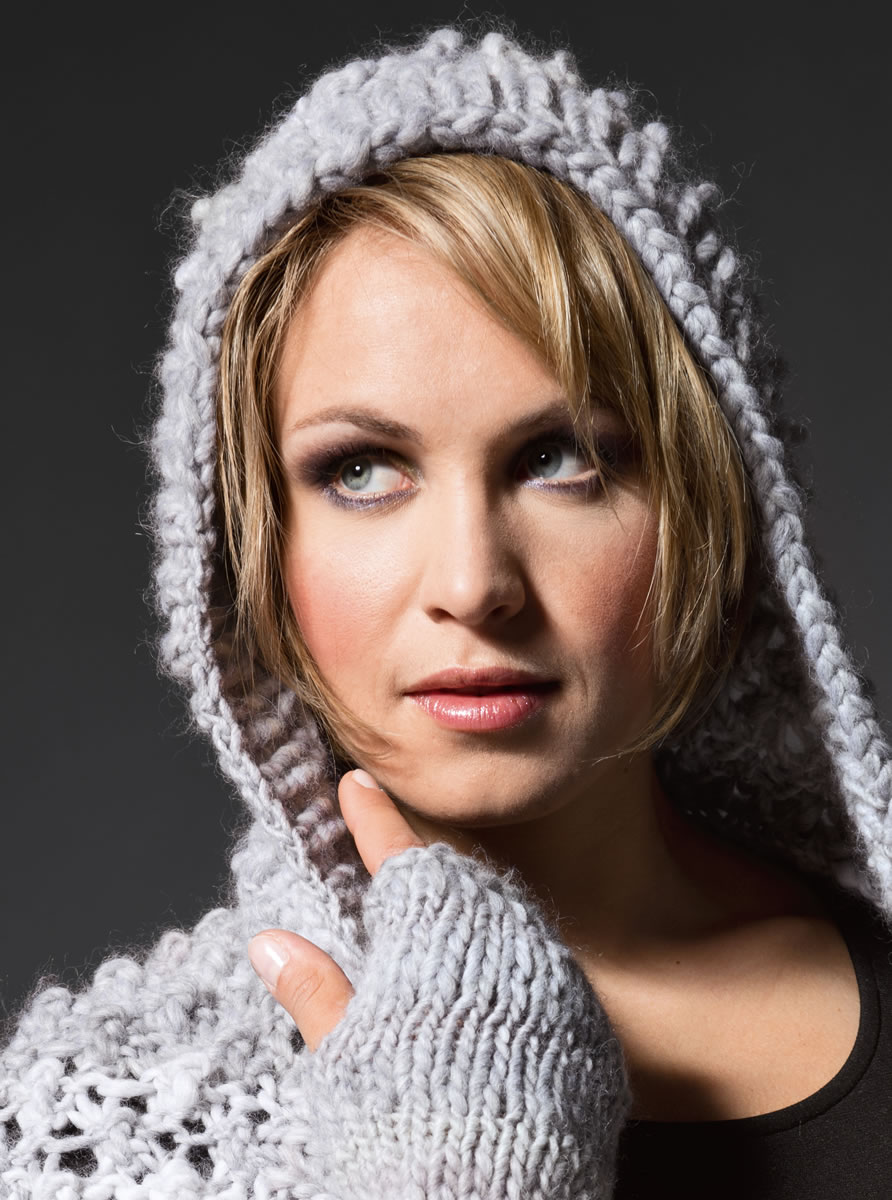 Lana Grossa-kvalitet „Olympia“ (53 % ren ny uld, 47 % polyakryl, løbelængde = 100 m / 100 gr.): ca. 600 (700-700) gr. råhvid/lysegrå (fv. 412) = 500(600-600) gr. til ærmesjalet og 100 gr. til pulsvarmerne, strikkepinde nr. 10, strømpepinde nr. 10.