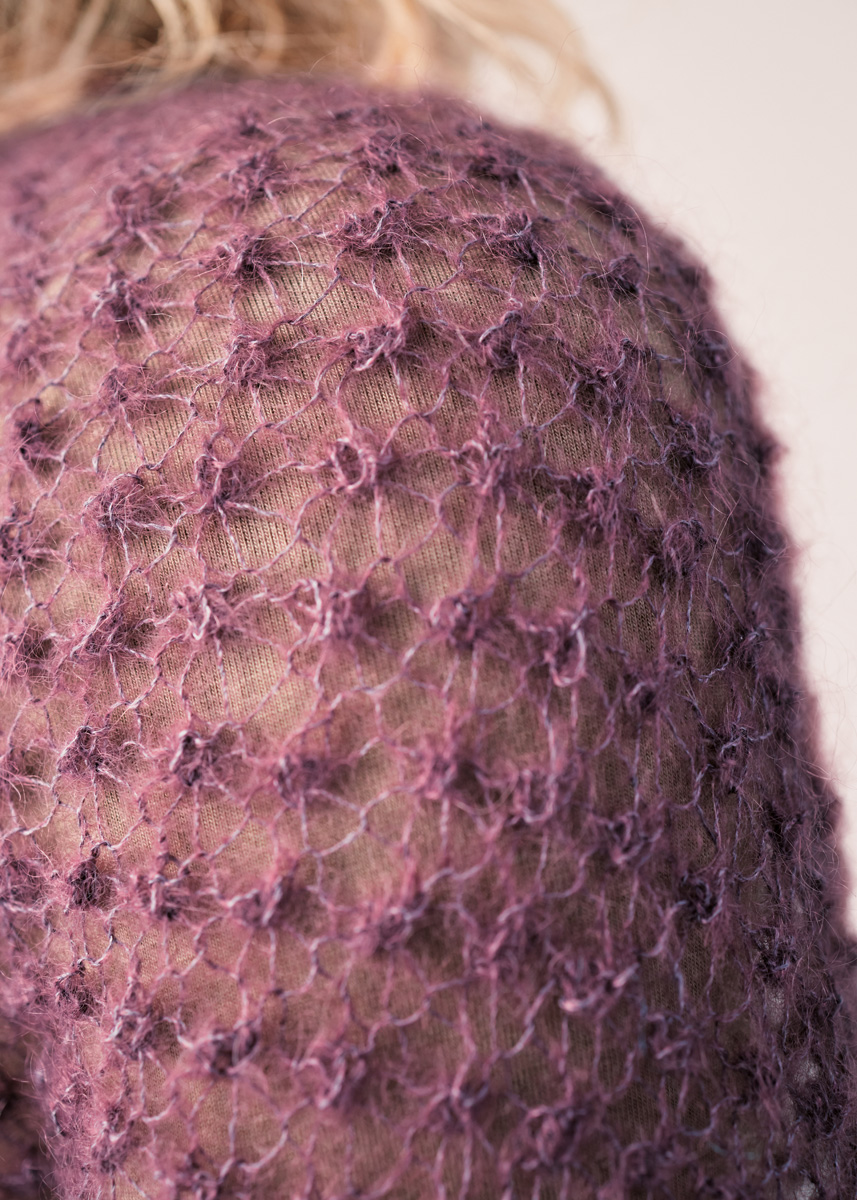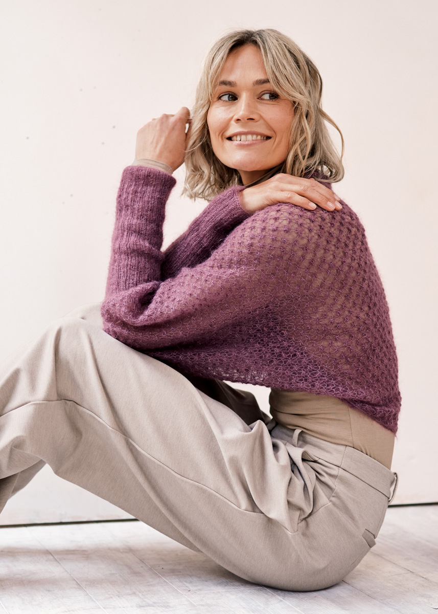 Lana Grossa Silkhair (70 % mohair (superkid), 30 % silke, löplängd 210 m/25 g), 100 (125) g mörkröd (färg 177); rundstickor nr. 4,5, 40 och 60 cm långa, samt strumpstickor nr. 3,5.