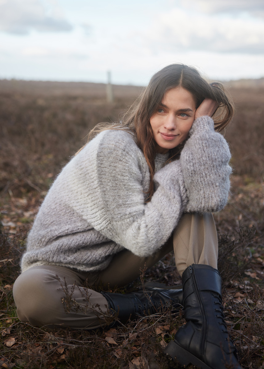 Garn: Avio fra Lana Grossa (63 % (fin) alpakka, 37 % polyamid, LL = ca. 150 m/50 g): ca. 250 (250 - 300 - 300) g sølv-/lys grå (frg nr. 9) Pinner: Nr. 5 og 5,5 og kort rundpinne nr. 5