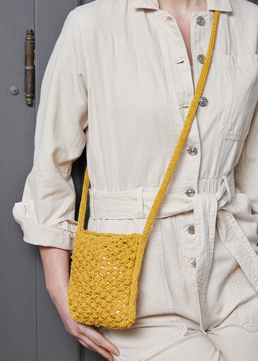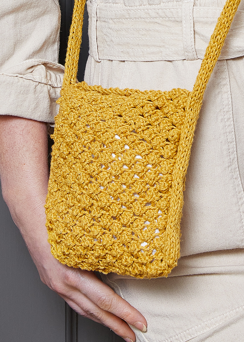 Lana Grossa-kvalitet „Landlust Sommerseide“ (50% silke, 50% bomull, löplängd ca. 170 m/50 g), 100 g guldgul (färg 18); stickor nr. 5, 2 strumpstickor nr. 5.