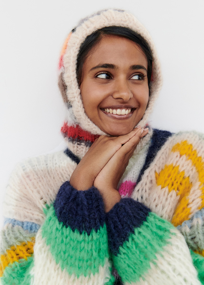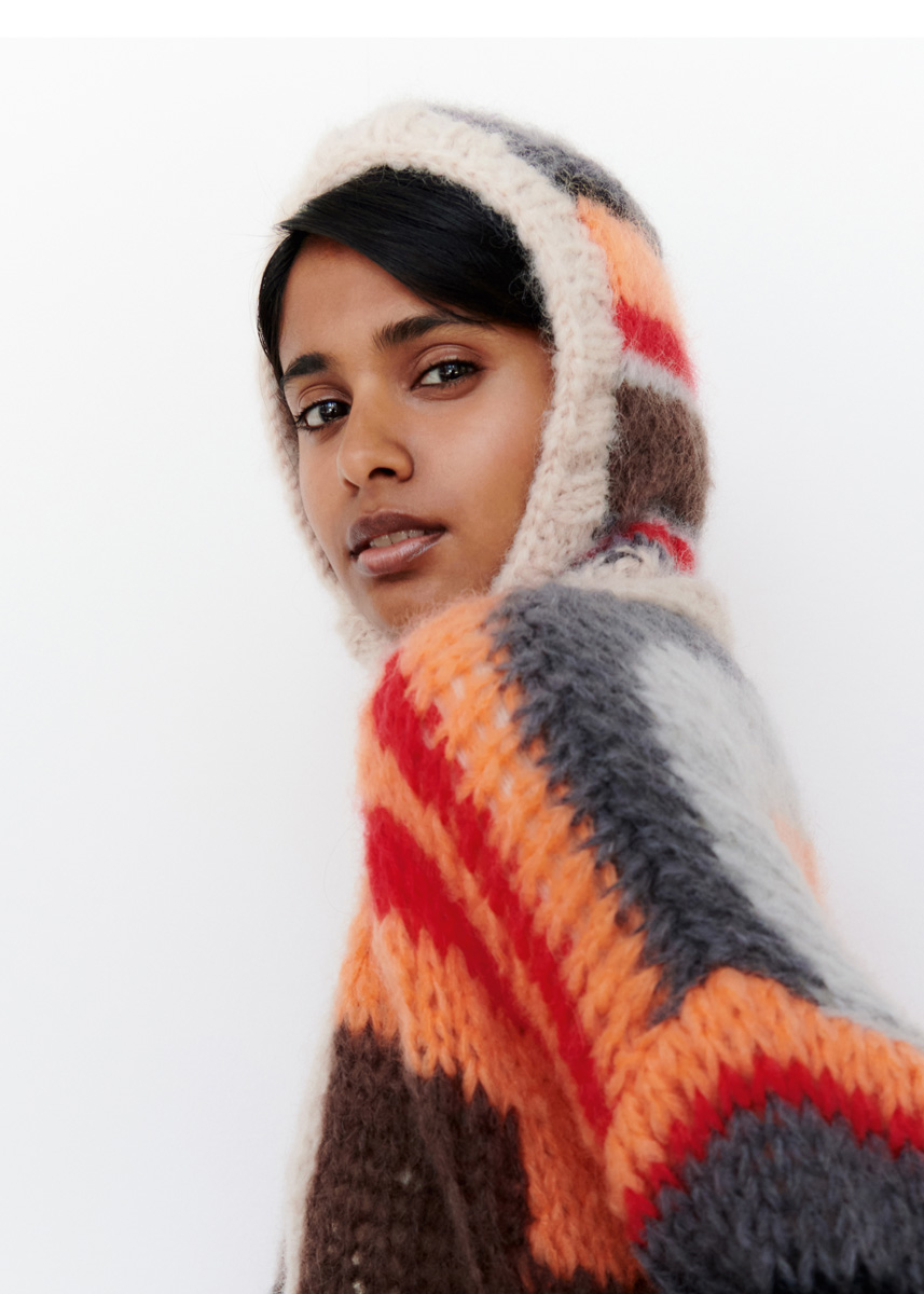 Lana Grossa „Mohair Moda“ (70% mohair (kid mohair), 20% ren ny ull (merino superfin), 10 % polyamid, löplängd 140 m/50 g), Färg-variant 1: 50 g nattblå (färg 5), 50 g grågrön (färg 3), 50 g gul (färg 1), 50 g råvit (färg 18), 50 g gråblå (färg 4), 50 g lindgrön (färg 2), 50 g beige (färg 11); färg-variant 2: 50 g beige (färg 11), 50 g mörkgrå (färg 15), 50 g röd (färg 14), 50 g ljusgrå (färg 17), 50 g svart (färg 16), 50 g mörkbrun (färg 12), 50 g rost (färg 13); färg-variant 3: 50 g råvit (färg 18), 50 g blå (färg 6), 50 g ljusgrå (färg 17), 50 g pink (färg 8), 50 g svart (färg 16), 50 g syrenrosa (färg 9), 50 g violett (färg 7); rundstickor nr. 6 och 7, längd 50 cm