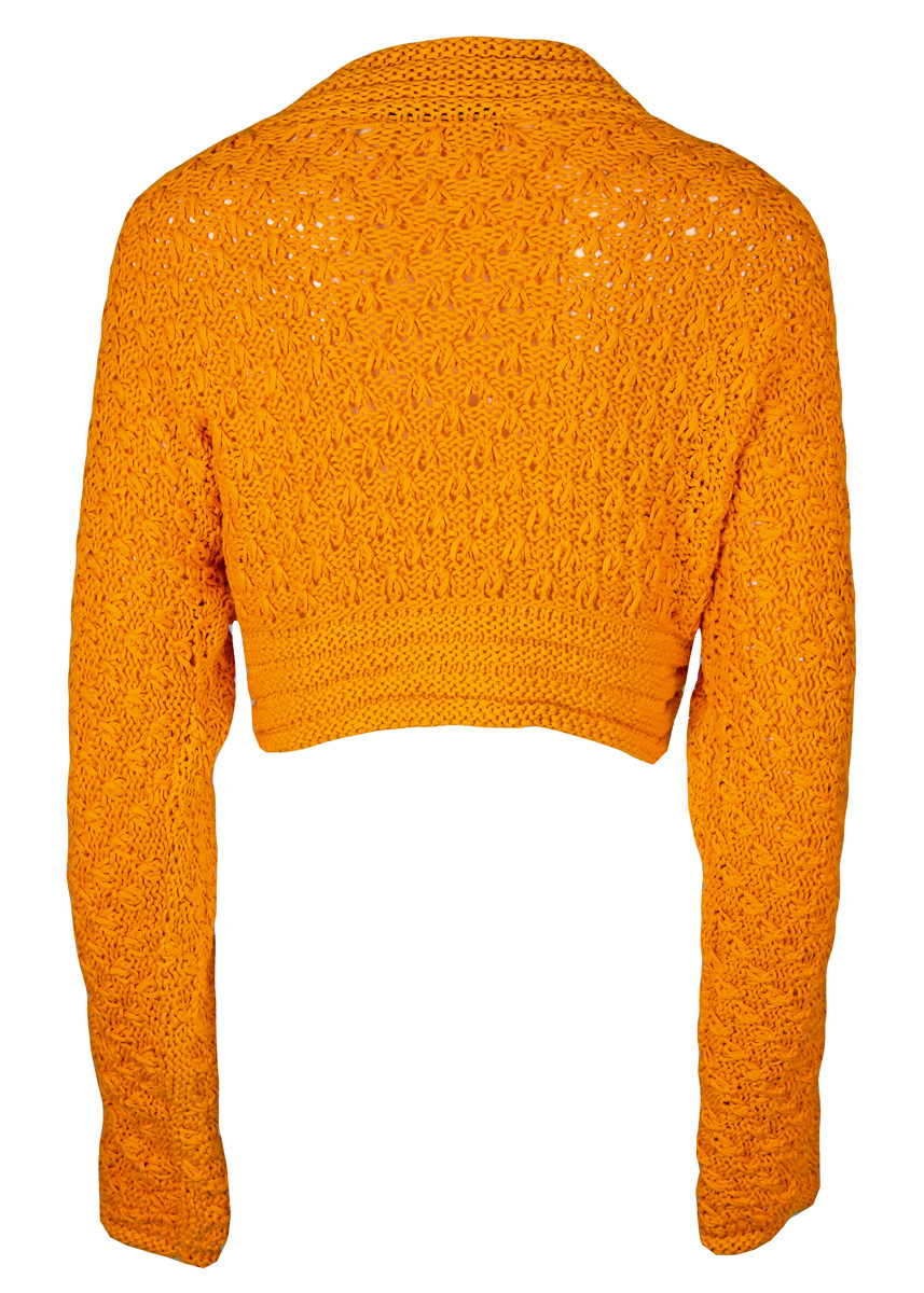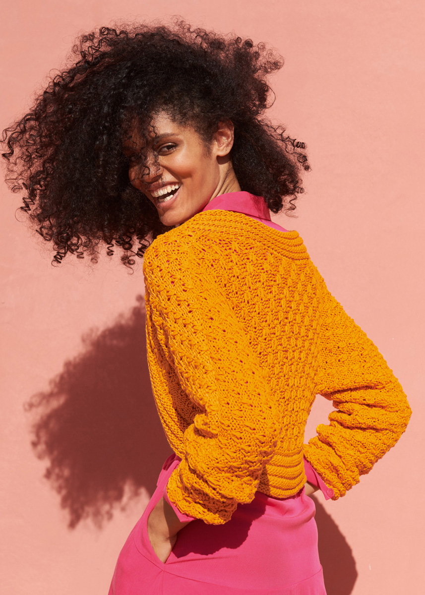 Lana Grossa-kvalitet „Certo” (100 % GOTS bomull, löplängd = ca. 115 m/50 g): ca. 400 (450) g orange (färg 1); stickor nr. 6, 1 rundsticka nr. 5,5, 60 cm lång, rundsticka nr. 5, 5,5 och 6, var 120 cm lång.
