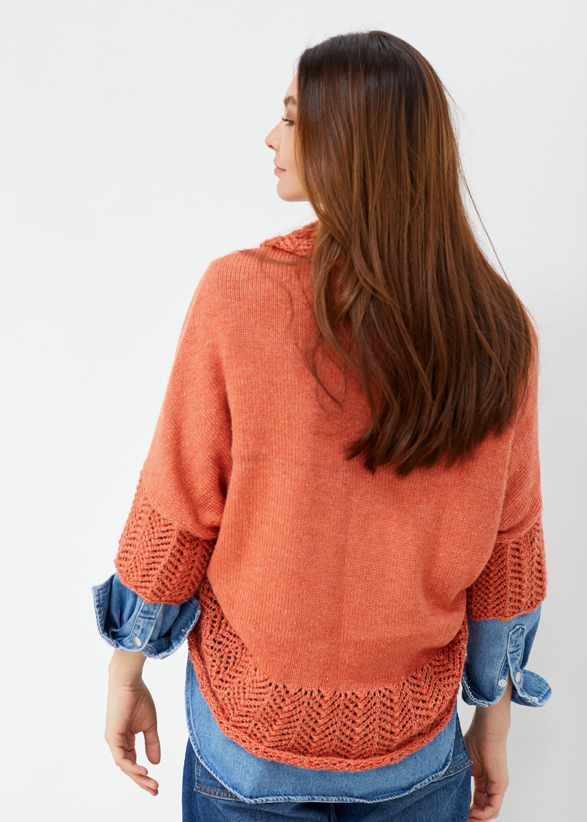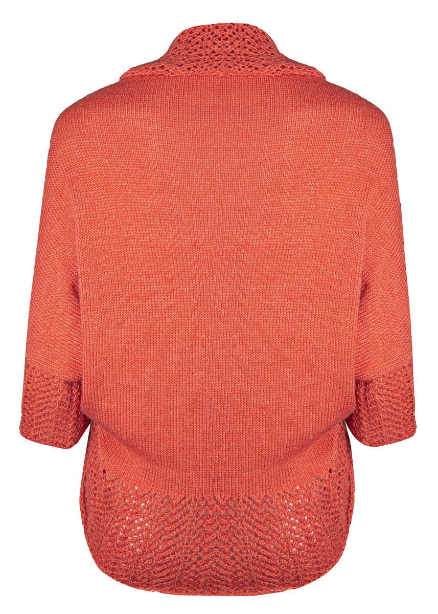 Lana Grossa Lace Seta Mulberry (35% silke (mulberry), 35% baby alpacka, 30% ren ny ull merino extrafin, löplängd 175 m/50 g), 300 (350 – 400) g laxröd (färg 8); 1 rundsticka nr. 3,5, 120 cm lång, strumpstickor nr. 3,5 eller 1 rundsticka nr. 3,5, 40 cm lång, 1 vajer från en rundsticka (till provisorisk uppläggning), 120 cm lång, 1 maskmarkörer.
