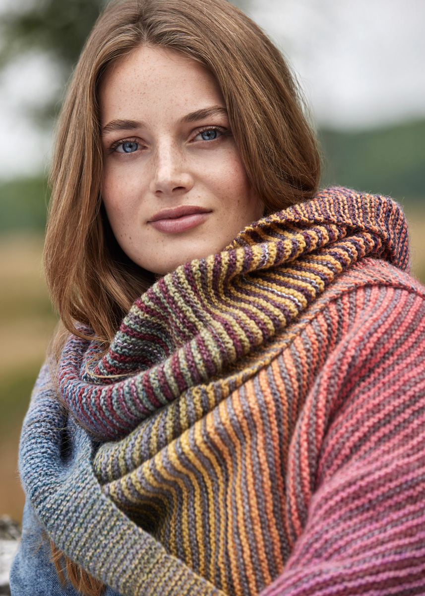 Lana Grossa-kvalitet „Gomitolo Maya“ (60 % ren ny ull, 40 % polyacryl, löplängd = ca 700 m/200 g): 200 g bordeaux/gråbrun/taupe/gråblå/duvblå/marin/nattblå (färg 857) och „Gomitolo Versione“ (60 % ren ny ull, 40 % polyacryl, löplängd = ca 700 m/200 g): 200 g blåviolett/viol/lax/gul/grön/petrol (färg 425); stickor nr. 4.