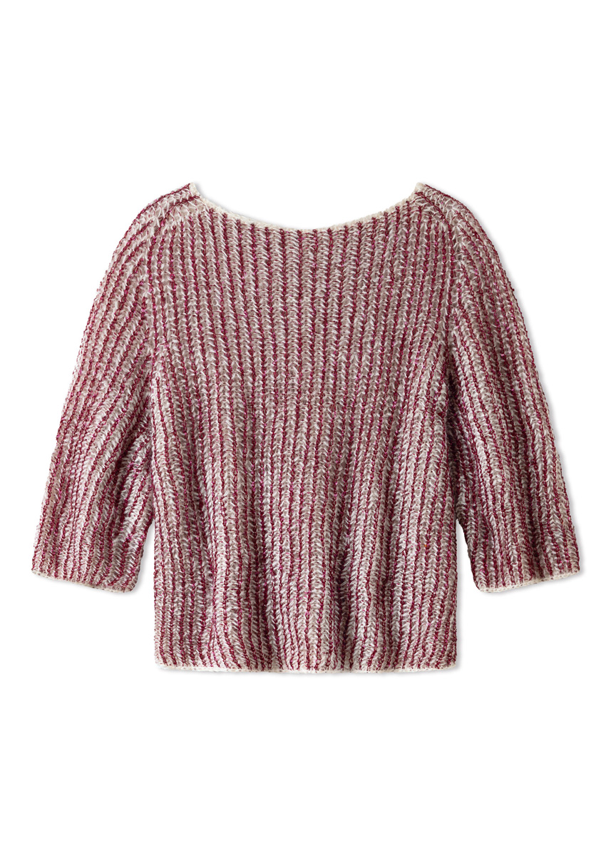 Garn: Lana Grossa «Glamour» (55 % polyamid, 45 % polyester, LL = ca. 115 m/25 g): Ca. 100 (150) g bordeaux (frg 9), Lana Grossa «Setasuri» (69 % alpakka (suri), 31 % silke, LL = ca. 212 m/25 g): Ca. 100 (150) g krem (frg 2). Pinner: Kort og lang rundpinne nr. 5, strømpepinner nr. 5. Tilbehør: Maskemarkører