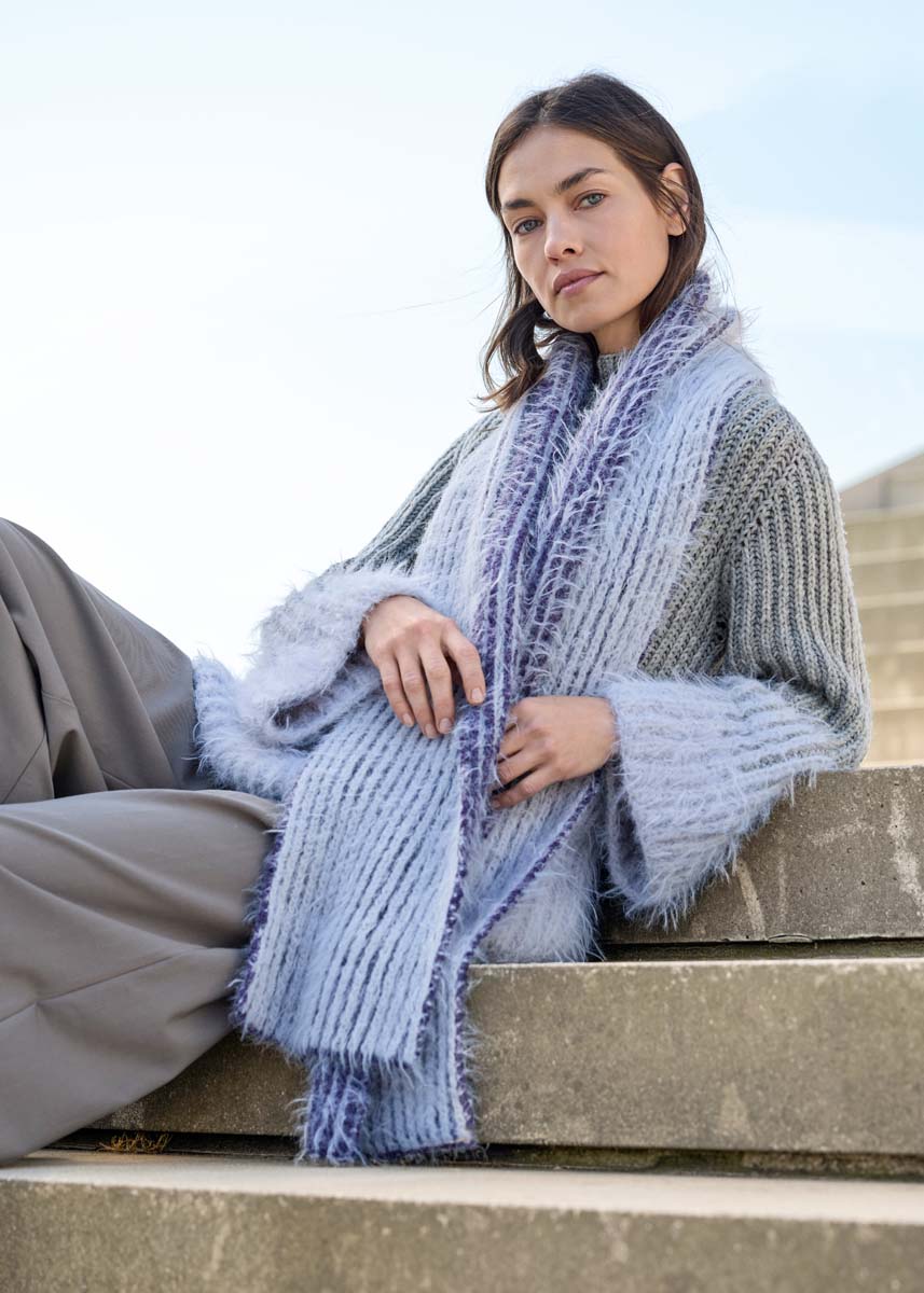 Lana Grossa-kvalitet „Basta“ (50 % ren ny ull (merino ), 50 % polyamid, løpelengde = ca 100 m/50 g): 150 g Sølvgrå (farge 4), Lana Grossa-kvalitet „Cool Merino“ (90 % ren ny ull (merino ), 10 % polyamid, løpelengde = ca 150 m/50 g): 100 g aubergine (farge 25); rundpinne nr. 6.