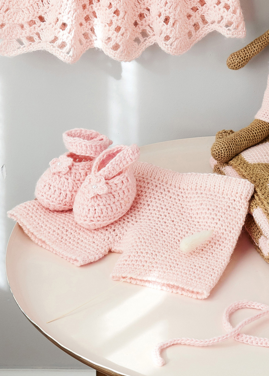 Lana Grossa-kvalitet ”Allora” (76 % bomuld, 14 % ren ny uld (merino superfine), 10 % alpaka (baby)), løbelængde = ca. 300 m / 50 gr.): 50 gr pastelrosa (fv 15), hæklenål nr. 3½, rundpind nr. 3½, 40 cm, en elastik på 2 cm i taljelængde.