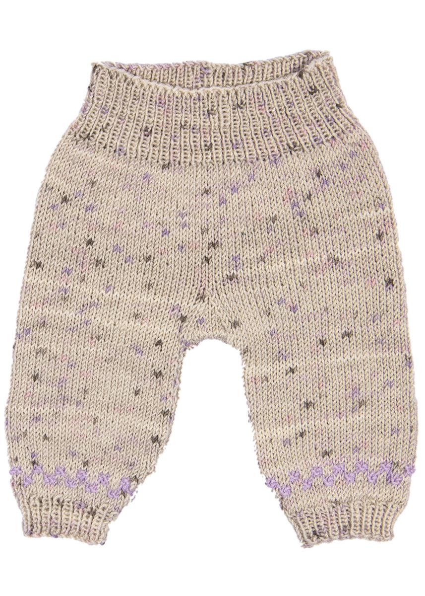 Lana Grossa-kvalitet ”Cool Wool Baby Print Punto” (100 % ren ny uld (merino), løbelængde = ca. 220 m / 50 gr.): 50(100) gr grège/lilla/mokka/rosa (fv 355) og Lana Grossa-kvalitet ”Cool Wool Baby” (100 % ren ny uld (merino), løbelængde = ca. 220 m / 50 gr.): 50 gr syren (fv 268), strikkepinde nr. 3, rundpind nr. 3, 40 cm.