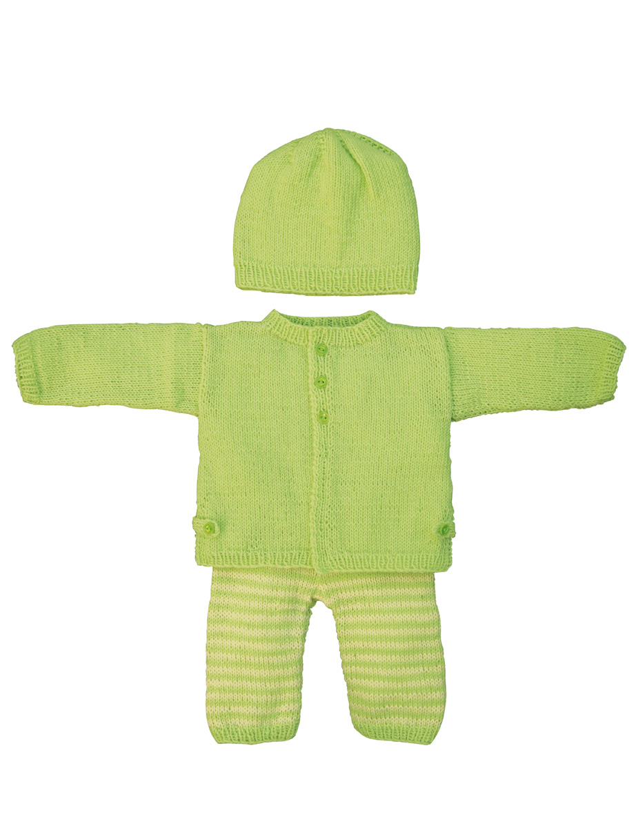 Lana Grossa-kvalitet ”Cool Wool Baby” (100 % ren ny uld, løbelængde = ca. 220 m / 50 gr.): 50 gr lime (fv 228) og 50 gr vanille (fv 218), strikkepinde nr. 3½, rundpind nr. 3½, 40 cm, en 2 cm bred taljeelastik i passende længde.
