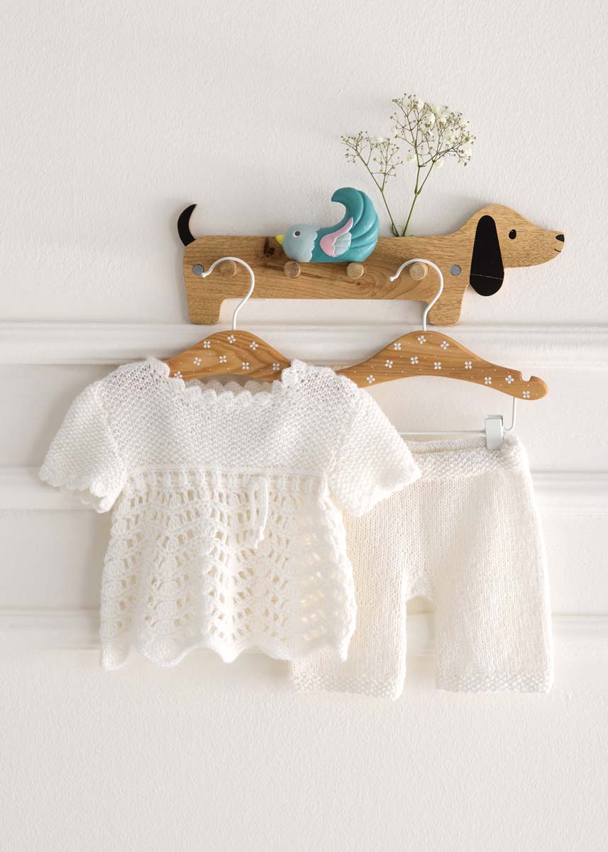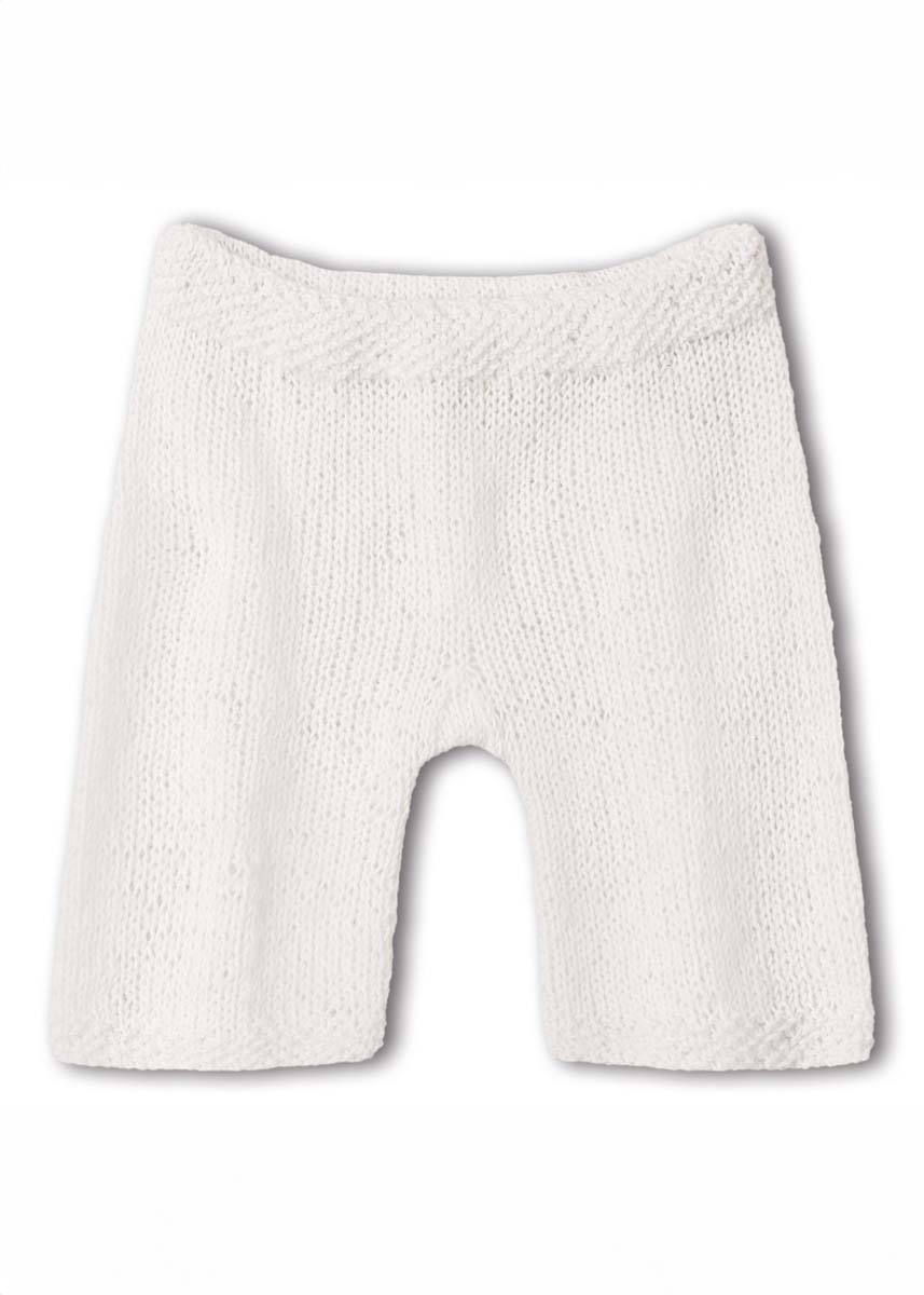 Lana Grossa Cool Wool Baby (100 % ren ny uld (ekstrafin merino), løbelængde = ca. 220 m / 50 gr.): 50 (50 – 100 – 100) gr hvid (fv 207), rundpind nr. 3 og 3½, taljeelastik 10 mm bred og ca. 50 (50 – 50 – 60) cm lang.