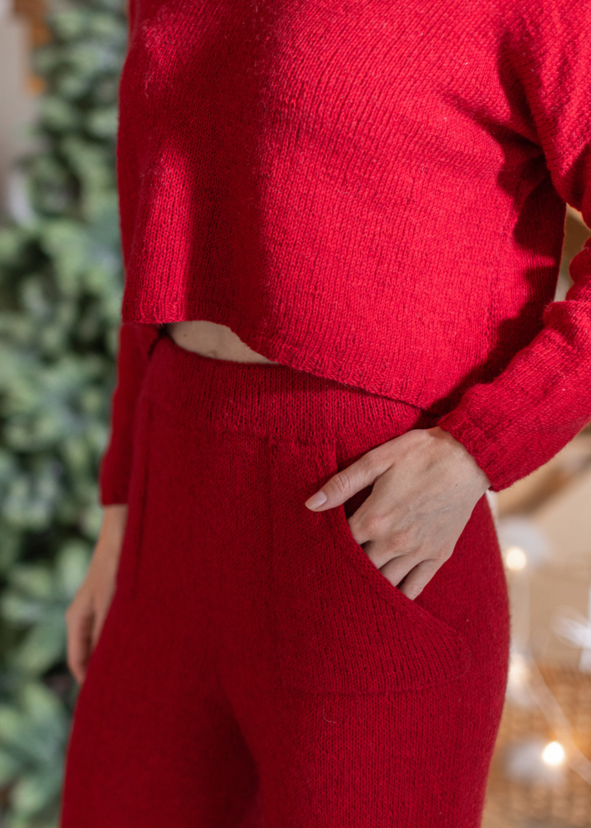Byxan stickas i ett stycke uppifrån och ned i rundstickning. Fickorna stickas separat och sys på i efterhand. Modellen har (mätt hängande) en invändig benlängd på 82 (81 - 80 - 79 - 78 - 77) cm, en midjevidd på 62 (70 - 78 - 86 - 98 - 110) cm, en lårvidd på 56 (61 - 66 - 71- 78 - 85) cm och en höftvidd på 86 (94 - 102 - 110 - 122 - 134) cm.