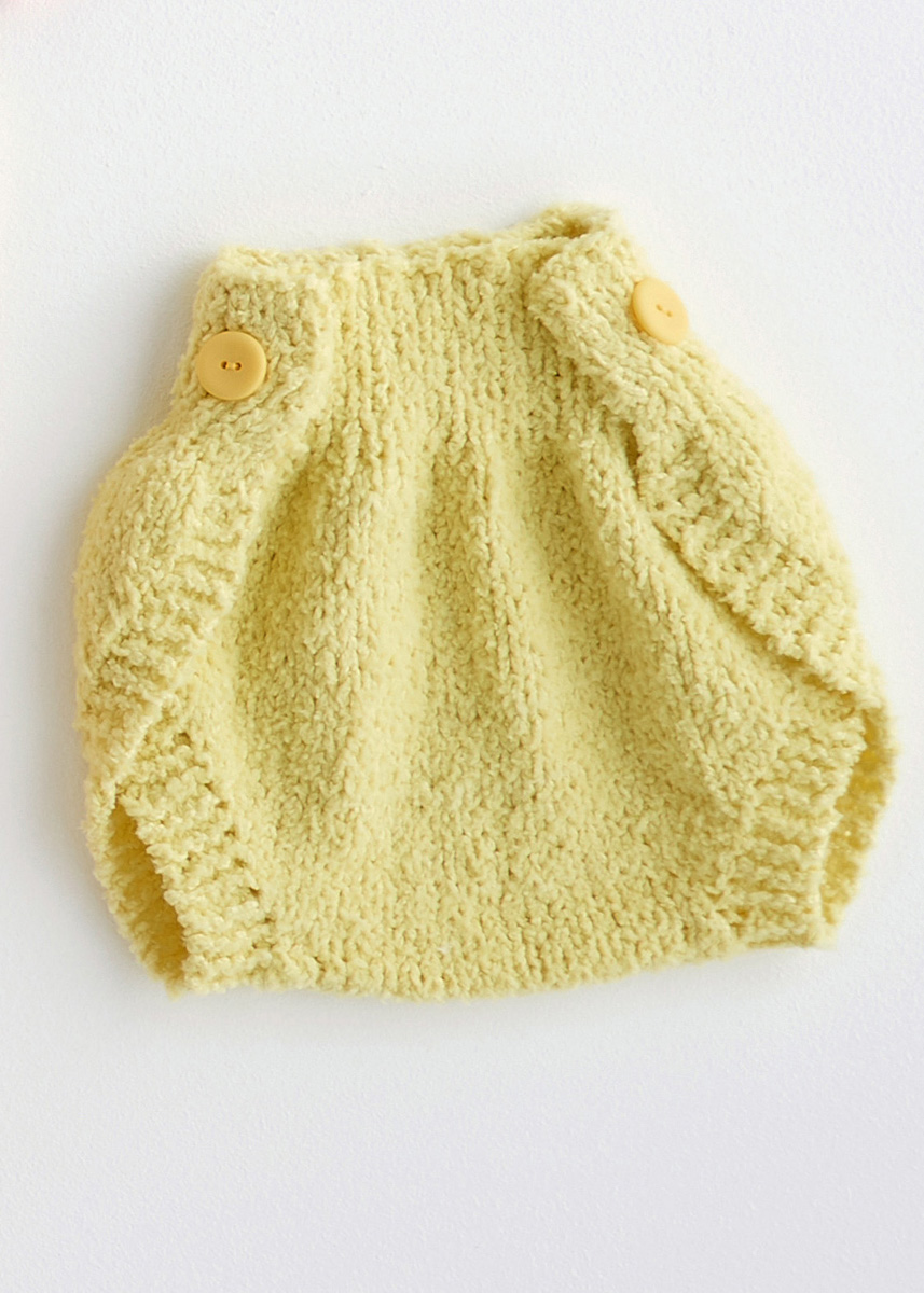 Lana Grossa-kvalitet ”Jolie” (75 % bomuld, 25 % polyamid, løbelængde = ca. 120 m / 50 gr.): 50(50-100-100) gr lysegul (fv 12) eller beige (fv 2), strikkepinde nr. 4½ og 5, 2 knapper 18 mm Ø en transparent elastik