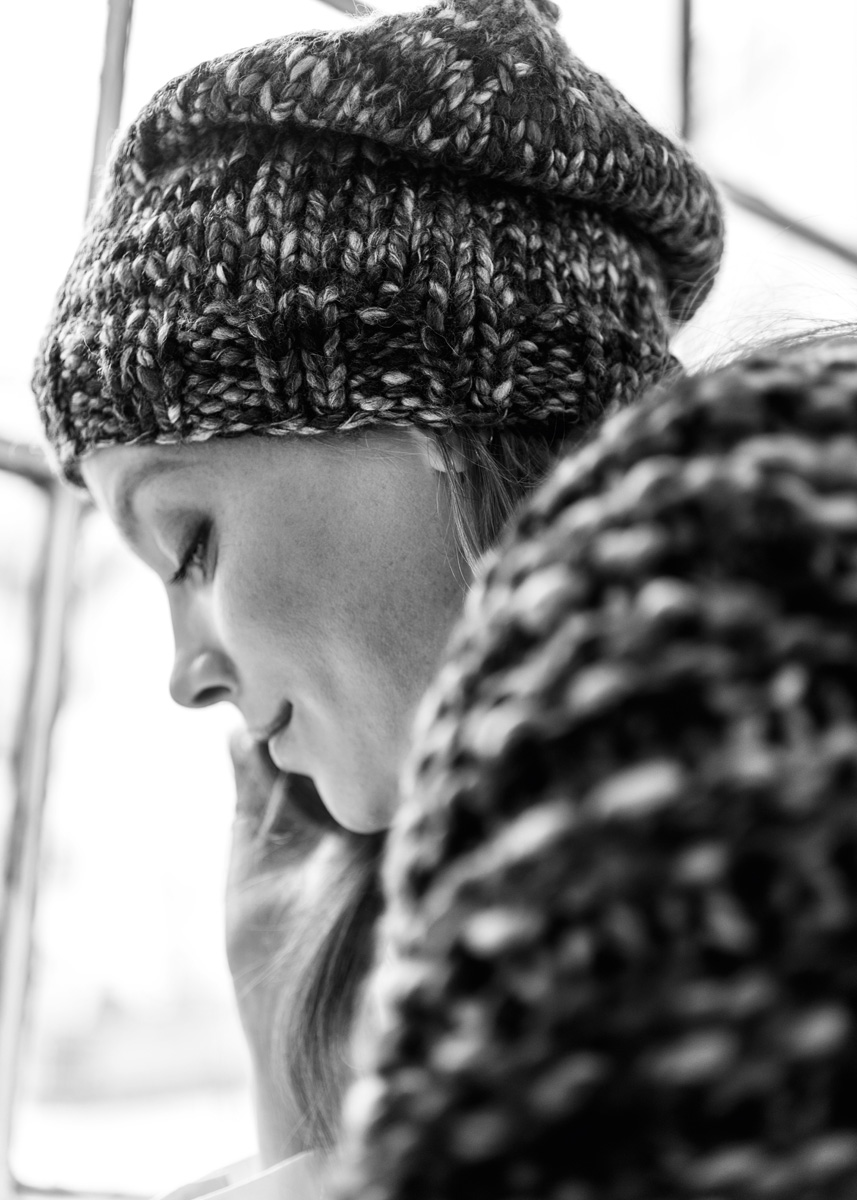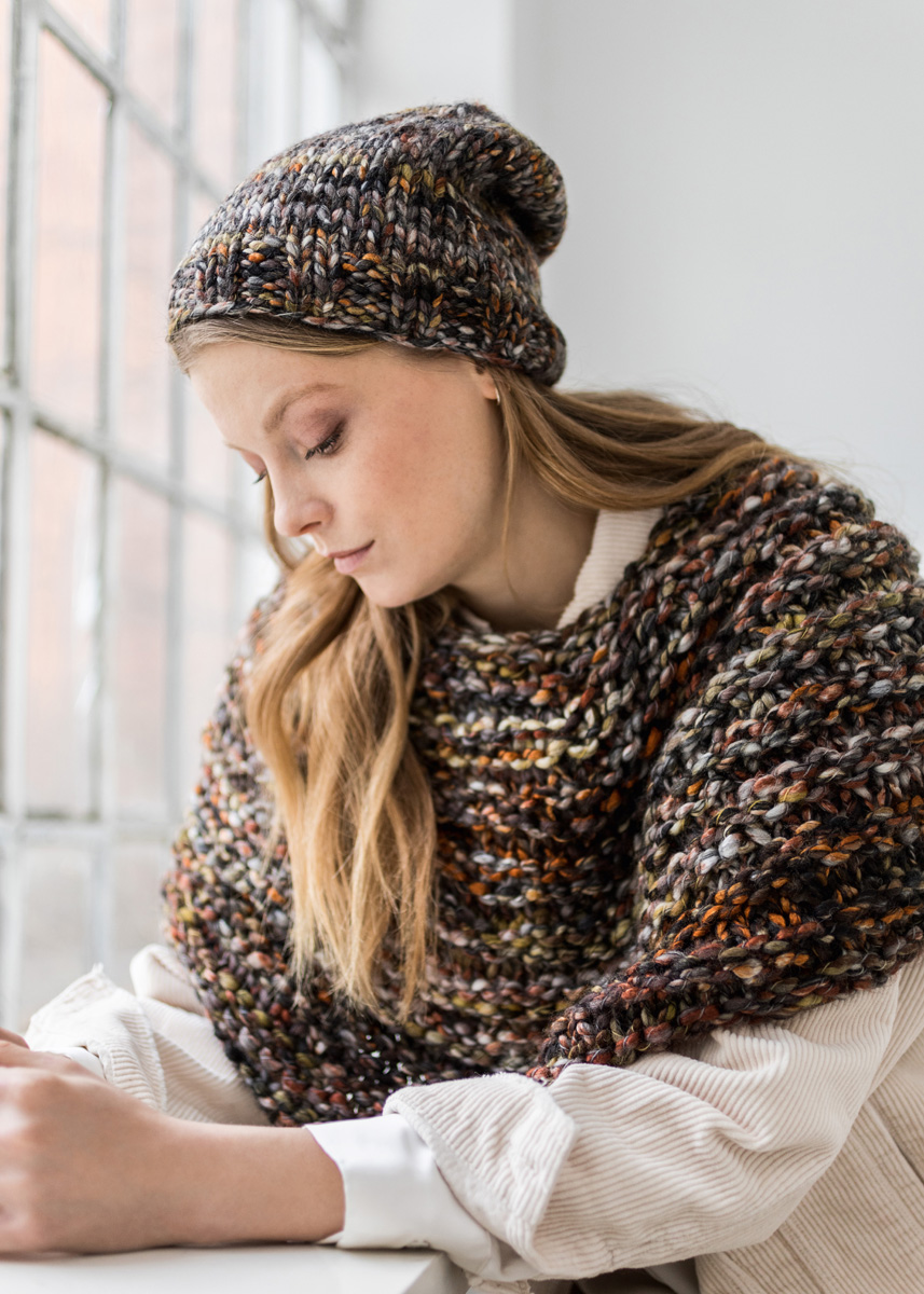 Lana Grossa-kvalitet „Allegra” (52 % ren ny ull, 48 % polyacryl, löplängd = ca. 50 m/100 g): ca. 400 g mörk brun/kamel/rost/grönbeige (färg 5); rundstickor nr. 15, 60 och 100 cm långa.