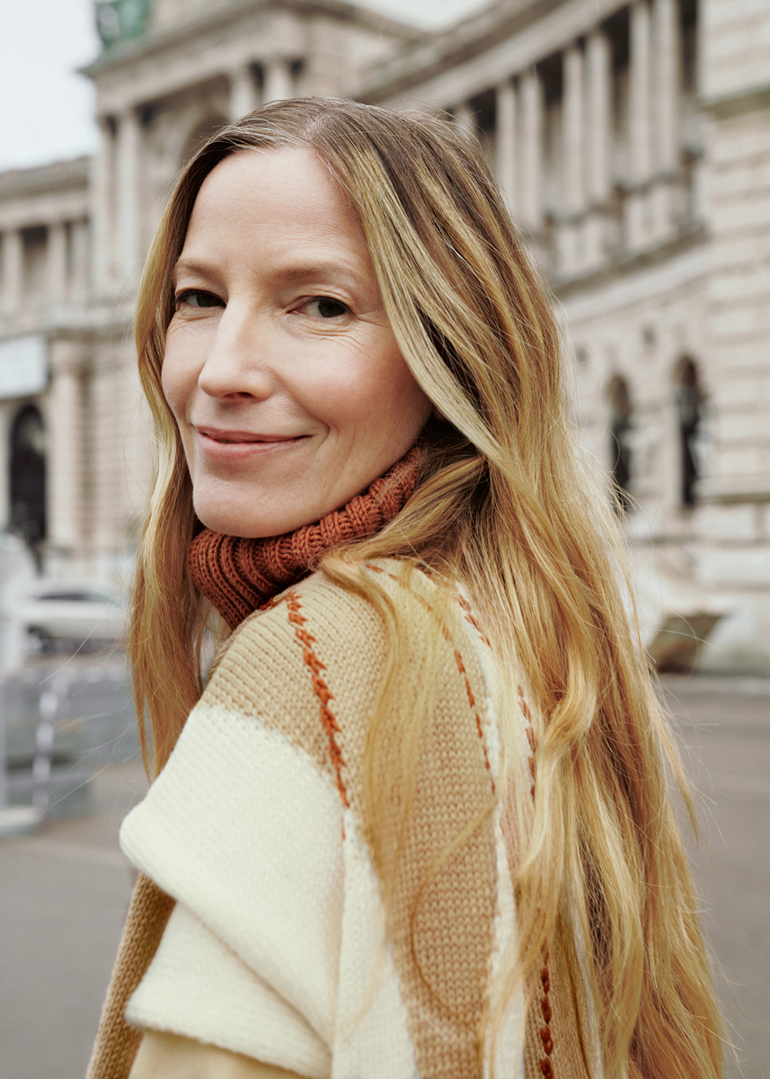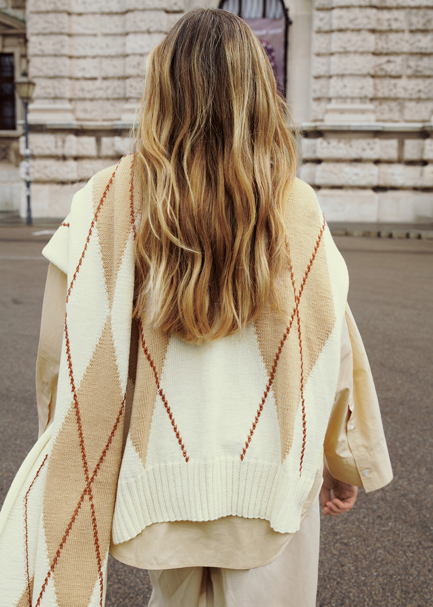 Lana Grossa Merino Superiore (100% ren ny ull (extrafin merino), löplängd 180 m/50 g), 400 (450) g creme (färg 2), 150 (200) g beige (färg 3) och 150 g rödbrun (färg 12); 1 rundsticka nr. 3,5, 40 och 80 cm lång, 1 ullnål.