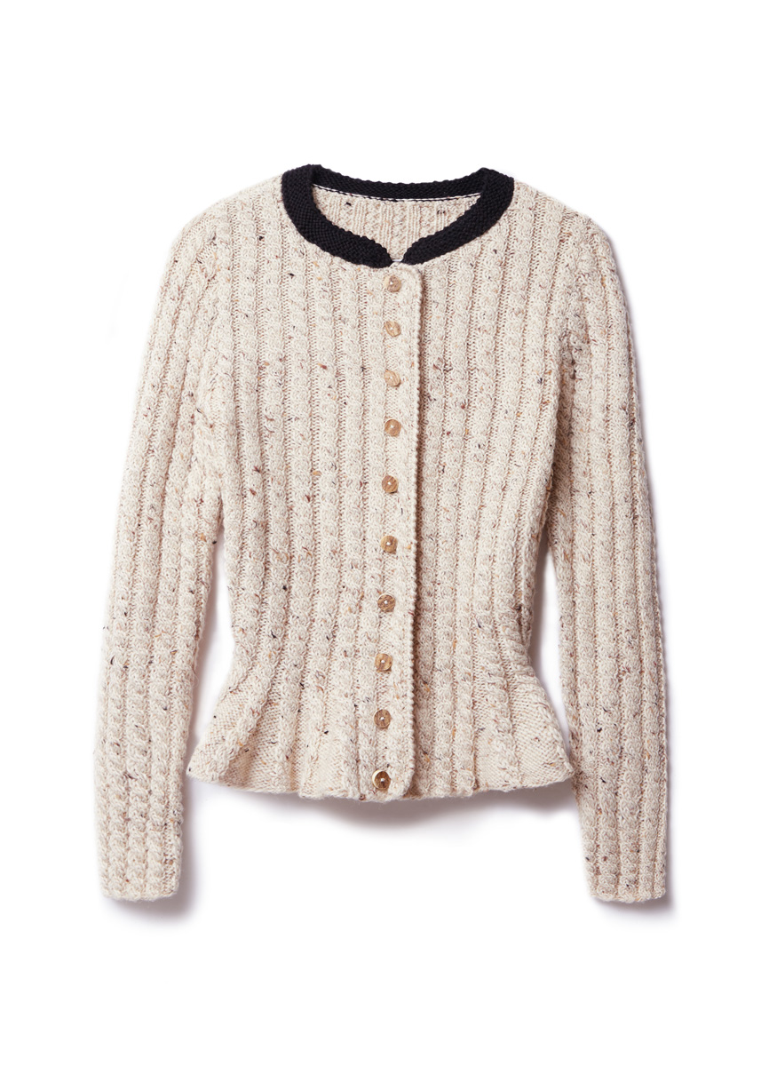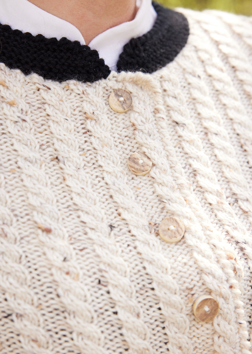 Lana Grossa Alpina (80% Schurwolle, 20% Polyamid, Lauflänge 210 m/100 g), 700 (700 – 800) g Natur meliert (Fb 10) und Lana Grossa Cool Wool Big (100% Schurwolle (Merino extrafine), Lauflänge 120 m/50 g), 50 g Schwarz (Fb 627); Stricknadeln Nr. 4, 1 Rundstricknadel Nr. 3, 40 cm lang, 1 Häkelnadel Nr. 3, 1 Zopfnadel und von UNION KNOPF 10 helle Hirschhornknöpfe, Ø 15 mm, 1 Druckknopf Schwarz, Ø 10 mm.
