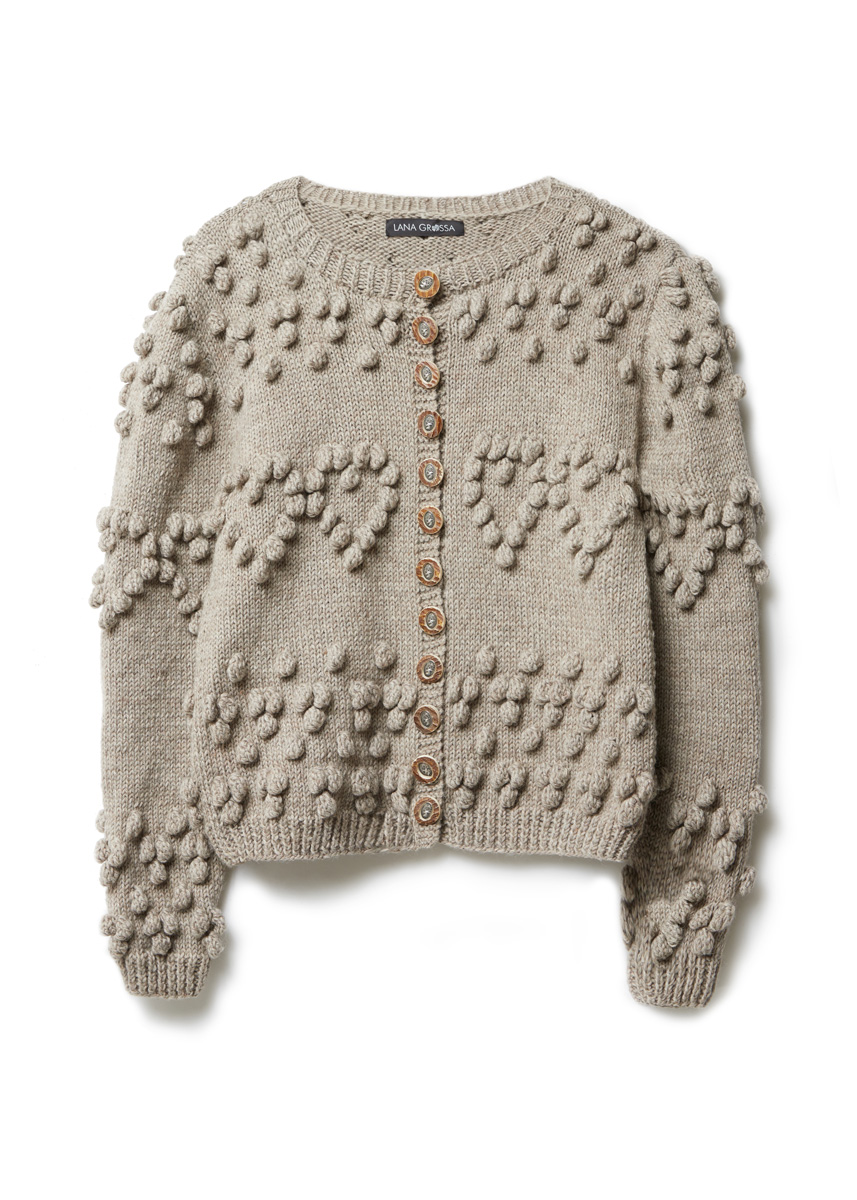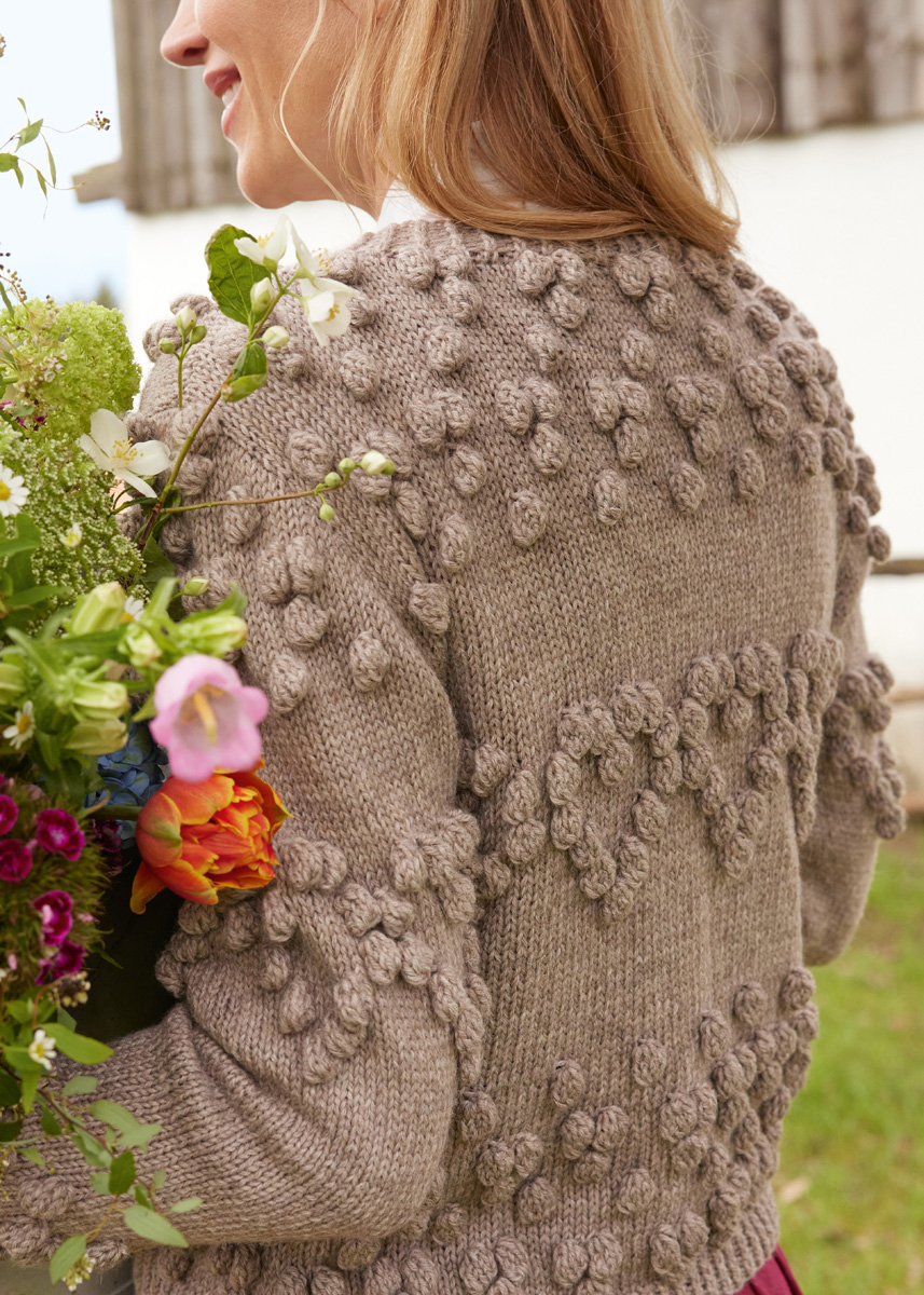 Lana Grossa Alpina (80% Schurwolle, 20% Polyamid, Lauflänge 210 m/100 g) 700 (700 – 800) g Hellbraun (Fb 1); Stricknadeln Nr. 3,5 und 5, 1 Rundstricknadel Nr. 3,5, 40 cm lang, sowie 12 Hirschhorn- Knöpfe mit Hirschkopf-Motiv von UNION KNOPF, Ø 22 mm.