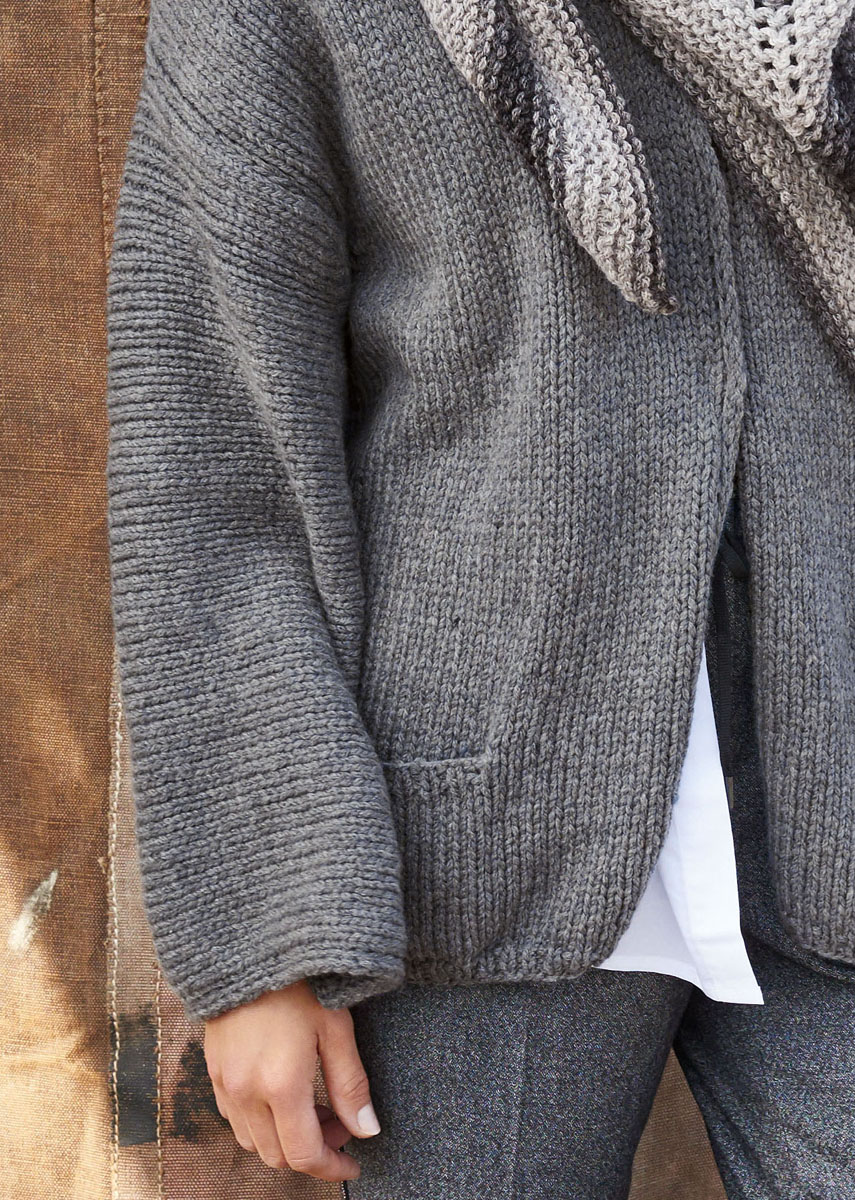 Lana Grossa-kvalitet ”Alta Moda Cashmere 16” (78 % ren ny uld 16μ, 12 % cashmere, løbelængde = ca. 110 m / 50 gr.): ca. 550(600) gr mørkegrå (fv 25), strikkepinde nr. 7 og 8, 3 trykknapper til påsyning fra Union Knopf, art. 19630, 20 mm Ø, fv 74, lysegrå