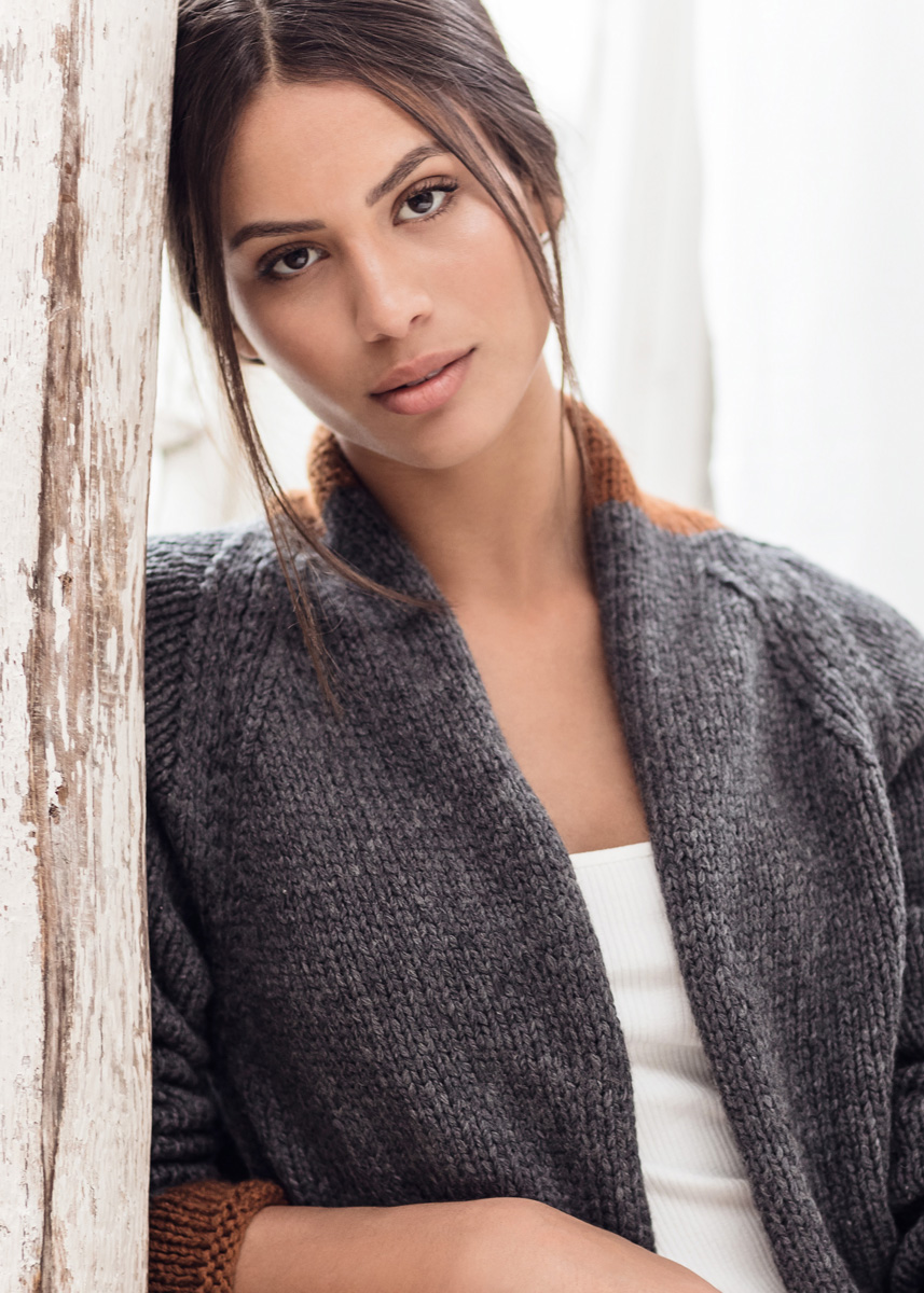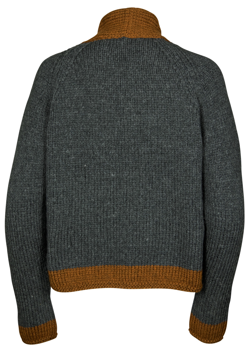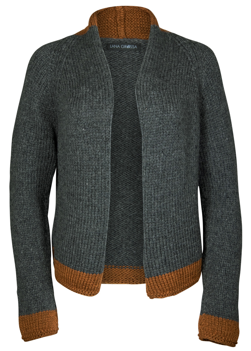 Lana Grossa Alta moda Cashmere 16 (78% ren ny ull merino, 12% kashmir, 10% polyamid, løpelengde 110 m/50 g), 400 (400 – 450) g nattgrå (farge 13) og 100 g brun (farge 42); strikkepinner nr. 6,5 og 7.