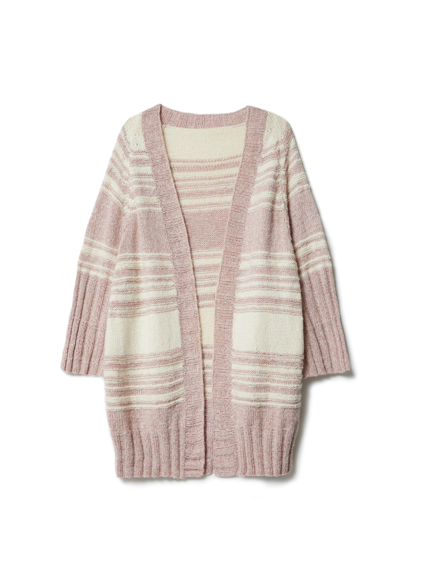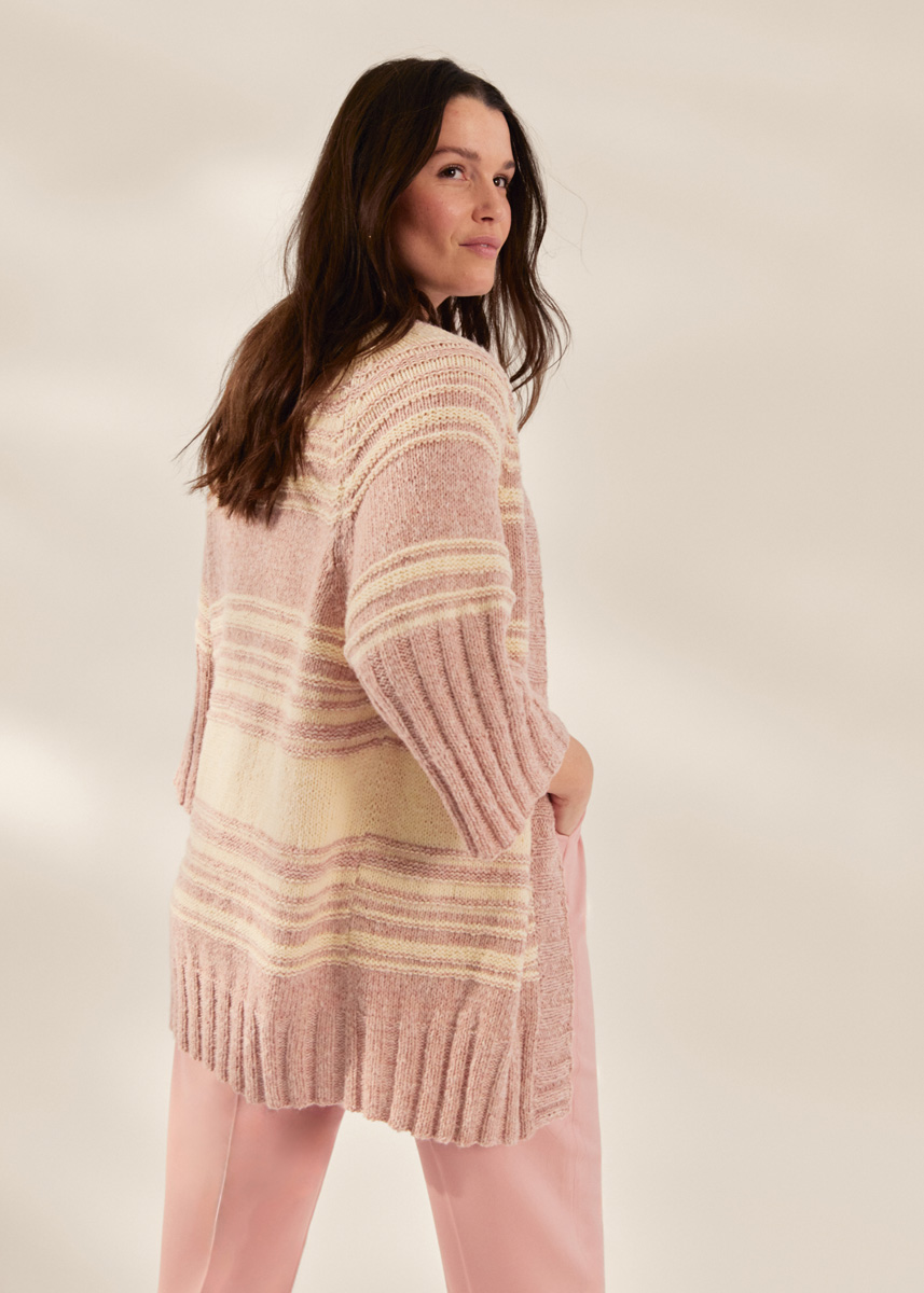 Lana Grossa Alta moda Cotolana (45% ren ny ull (merino), 45% (Pima) bomull, 10% polyamid, löplängd 150 m/50 g), 250 (300 – 350 – 400) g gammalrosa (färg 7) och 100 (150 – 150 – 200) g vanilj (färg 20) och Lana Grossa Bella (35% bomull, 25% alpacka (baby), 30% nylon, 10% ren ny ull (merino), löplängd 250 m/25 g), 75 (100 – 100 – 125) g mjukrosa (färg 3) och 25 (50 – 50 – 75) g råvit (färg 1); stickor nr. 4 och 5, samt 1 rundsticka nr. 5, 120 cm lång. OBS: Modellen stickas med dubbla trådar, 1 tråd Alta moda Cotolana och 1 tråd Bella!