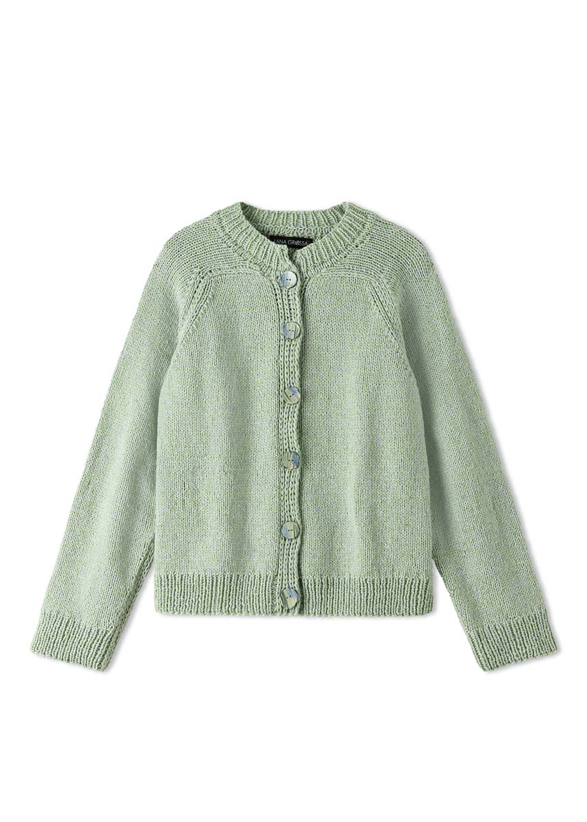 Lana Grossa Alta Moda Cotolana (45% ren ny ull merino, 45% Pima bomull, 10% polyamid, løpelenge 150 m/50 g), 350 (400 – 450) g epplegrønn (farge 10) og Lana Grossa Sottile (85% bomull, 15% ren ny ull (merino), løpelenge 250 m/50 g), 250 (300 – 300) g pastellgrå (farge 25); 1 rundpinne nr. 4,5, 40 cm lang, 1 rundpinne nr. 5, 80 cm lang, 6 maskemarkører og 6 knapper fra UNION KNOPF, Ø 22 mm.