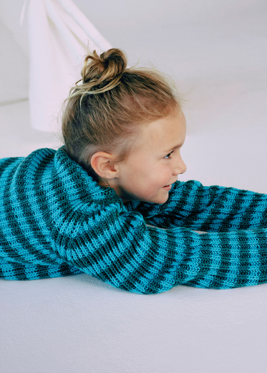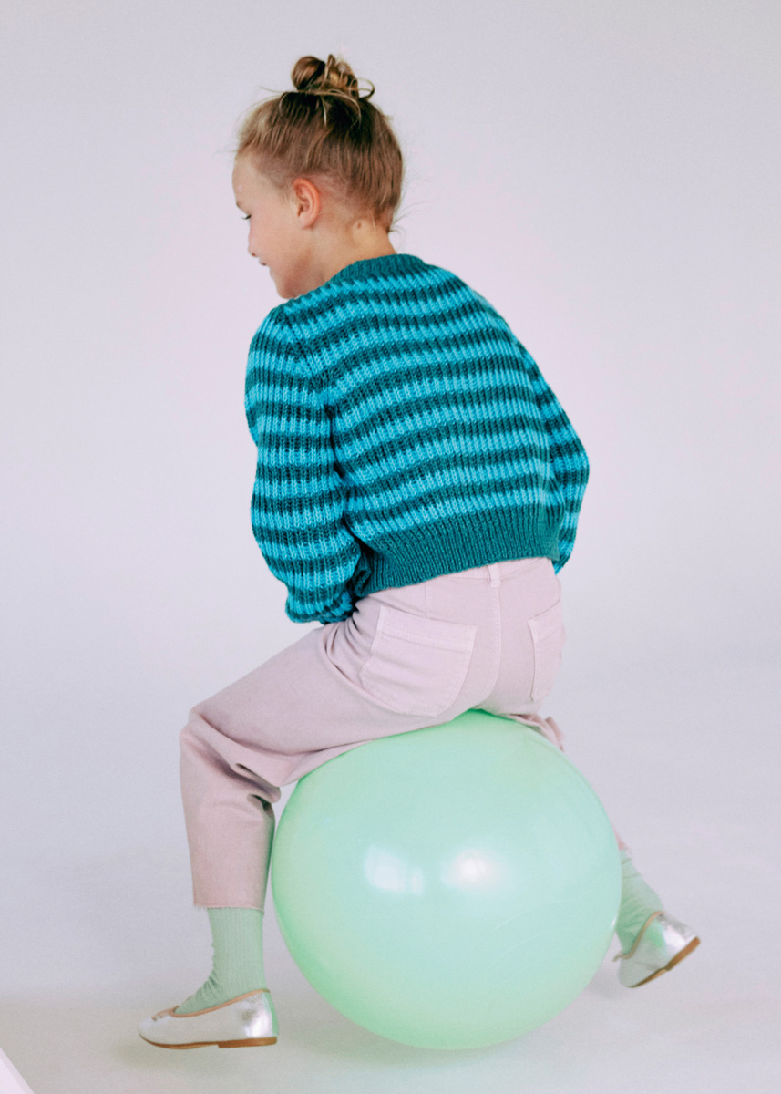 Lana Grossa Alta moda Cotolana (45% ren ny ull (merino), 45% (Pima) bomull, 10% polyamid, löplängd 150 m/50 g), 150 (150 – 200) g petrol (färg 13) och 150 (150 – 200) g turkos (färg 28); stickor nr. 3 och 4, 1 rundsticka nr. 3, 60 cm lång och 4 knappar från UNION KNOPF, färg petrol, Ø 20 mm.