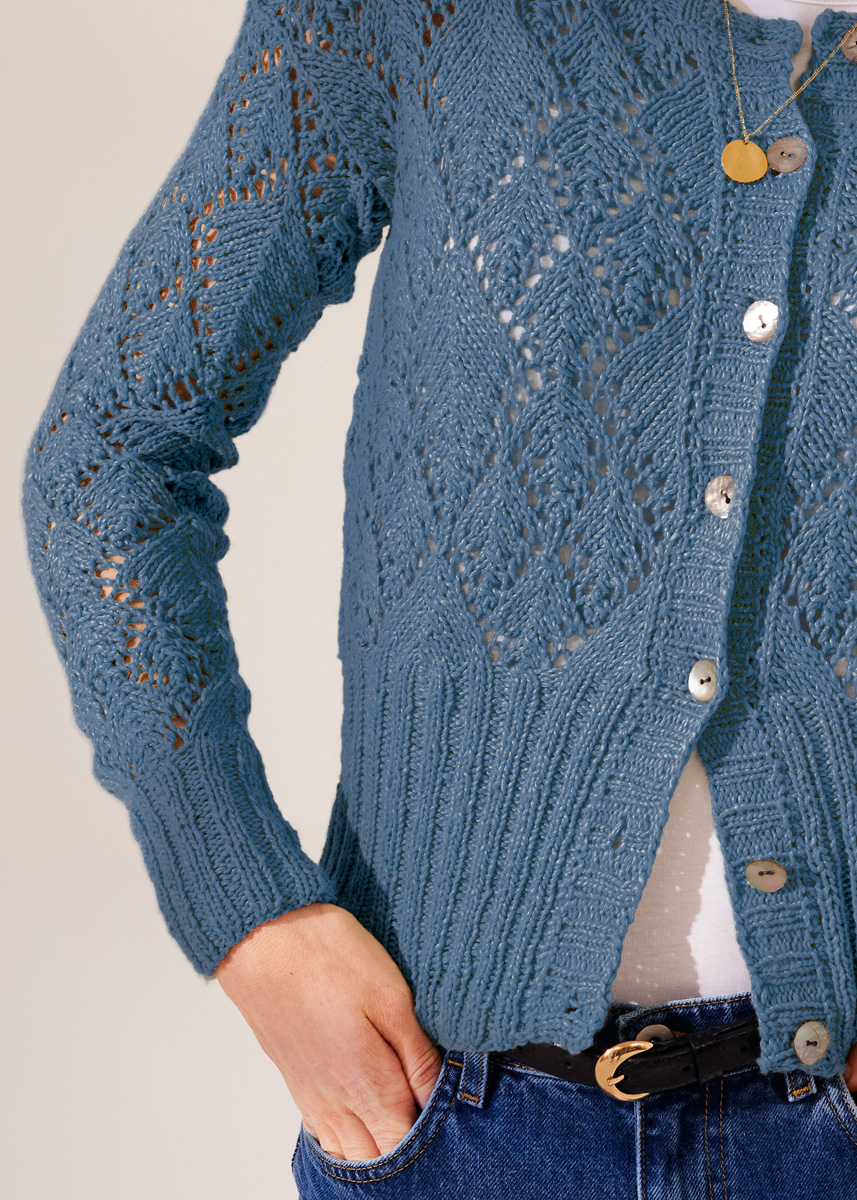 Lana Grossa-kvalitet „Bacca” (100 % bomull, löplängd = ca. 120 m/50 g): ca. 350 g jeans (färg 5); stickor nr. 3 och nr. 4, 1 rundsticka nr. 3, 60 cm lång; 7 passande knappar, 16 mm Ø.
