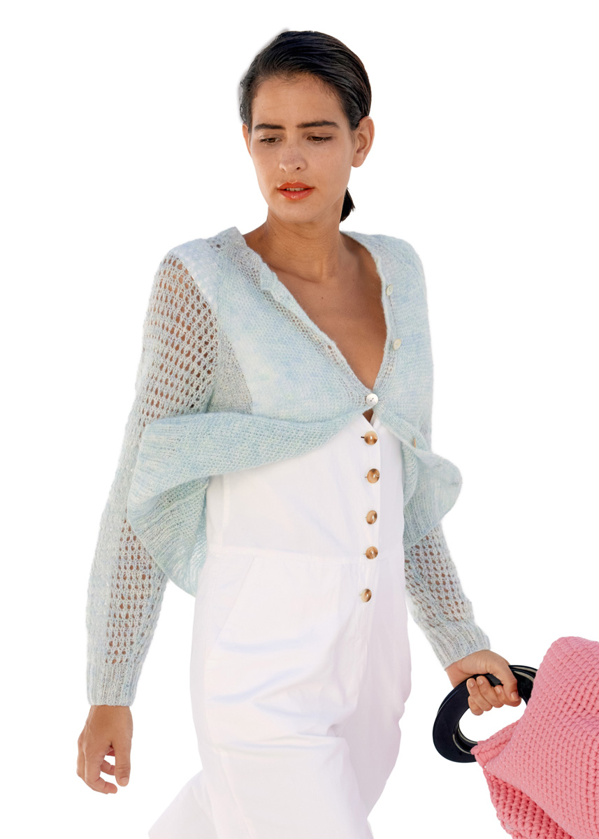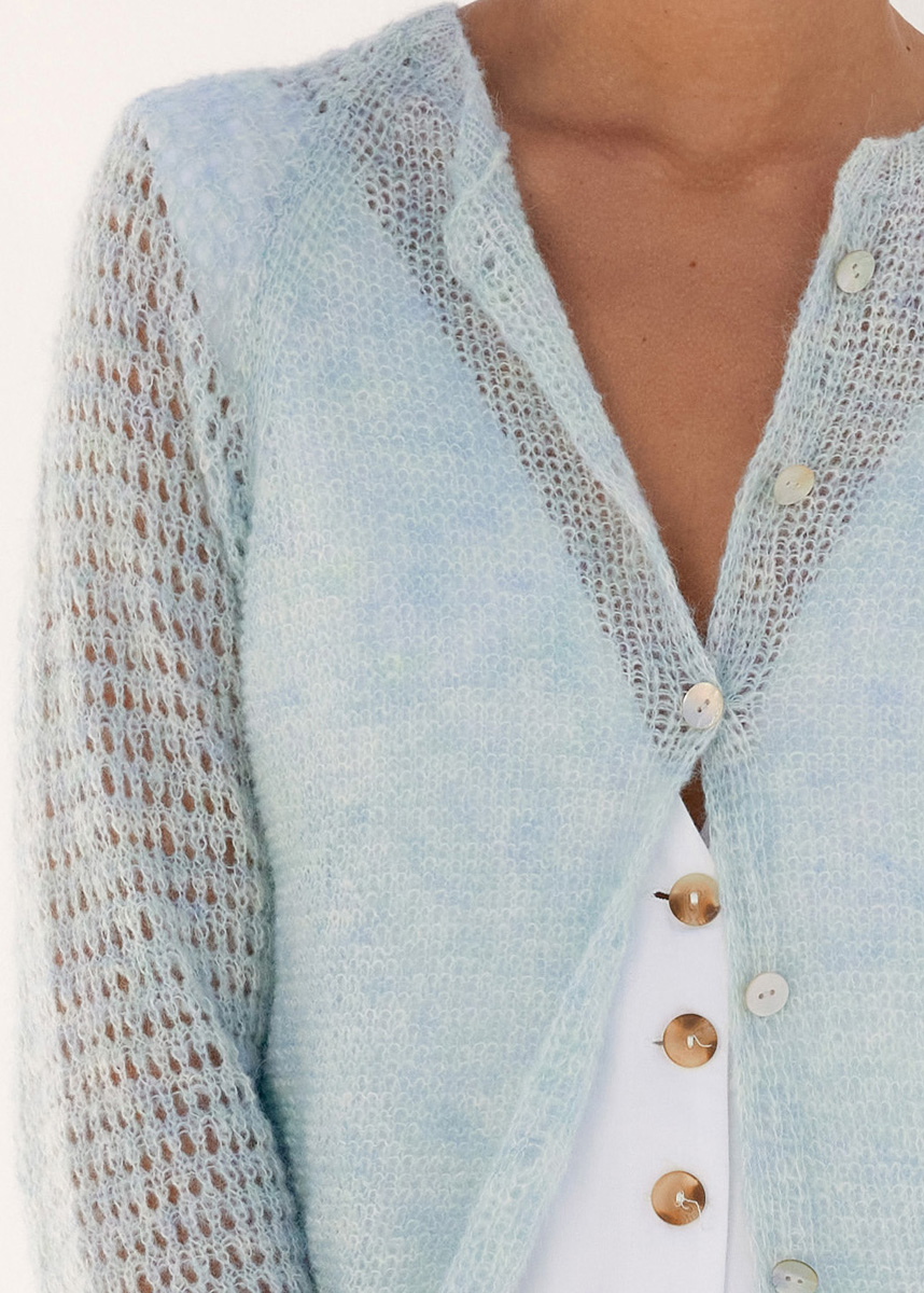 Lana Grossa-kvalitet „Bella“ (35 % bomull, 30 % nylon, 25 % (baby) alpacka, 10 % ren ny ull (merino), löplängd = ca. 250 m/25 g): ca. 100 (125 - 150) g i isblå (färg 13); stickor nr. 2,5, och nr. 3, 1 rundsticka nr. 2,5, 40 cm lång, 6 pärlemor-knappar från Union Knopf, 15 mm Ø, färg 12, Art. 46286.