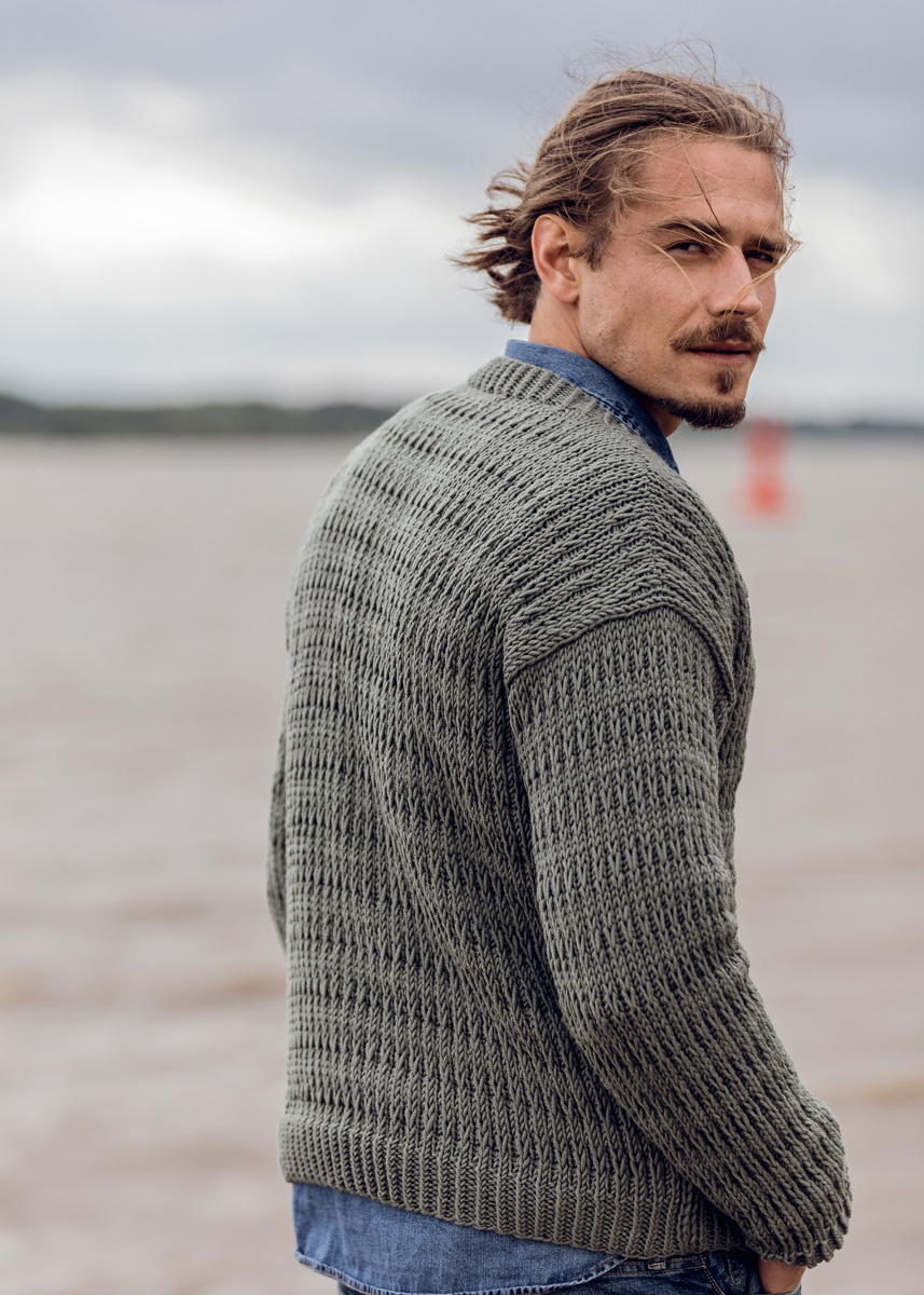 Lana Grossa Bingo (100% ren ny ull, löplängd 80 m/50 g), 750 (800 – 850) g khaki (färg 732); stickor nr. 5 och 6, 1 rundsticka nr. 5, 100 cm lång och 5 knappar från UNION KNOPF, Art. 451190, färg 26, st. 23 mm.