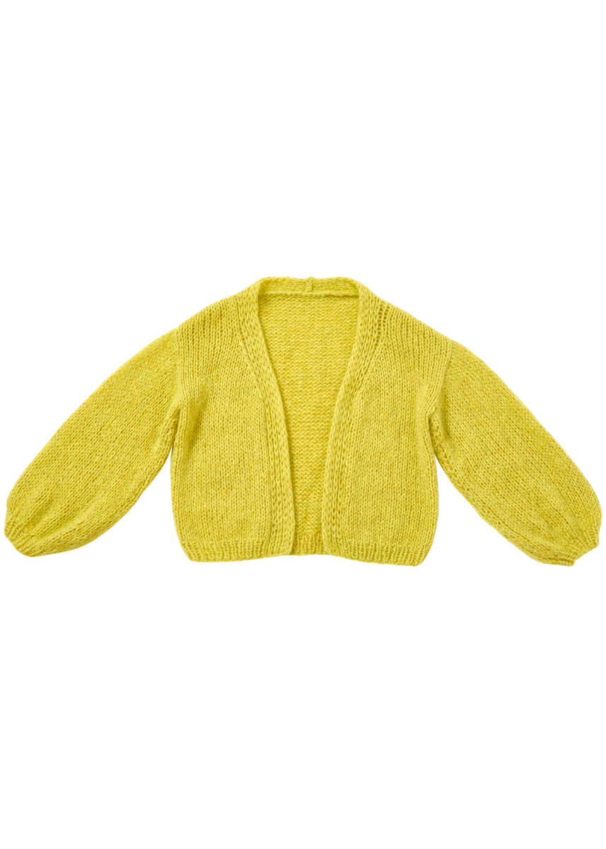 Lana Grossa-kvalitet „Brigitte No. 2“ (47 % alpacka, 45 % bomull, 8 % ren ny ull, löplängd 140 m/50 g): 250 (250/300/300) g i kiwi (färg nr. 39) och „Brigitte No. 3“ (20 % mohair, 57 % ren ny ull, 23 % polyamid, löplängd 100 m/ 25 g): 150 (150/175/200) g i citrusgul (färg nr. 39). Stickor 8 och 10 (löst stickat) eller 10 och 12 (stramt stickat) – kontrollera stickfastheten. Modellen stickas med dubbla trådar - 1 tråd i var garnkvalitet.