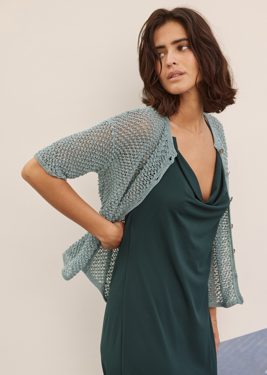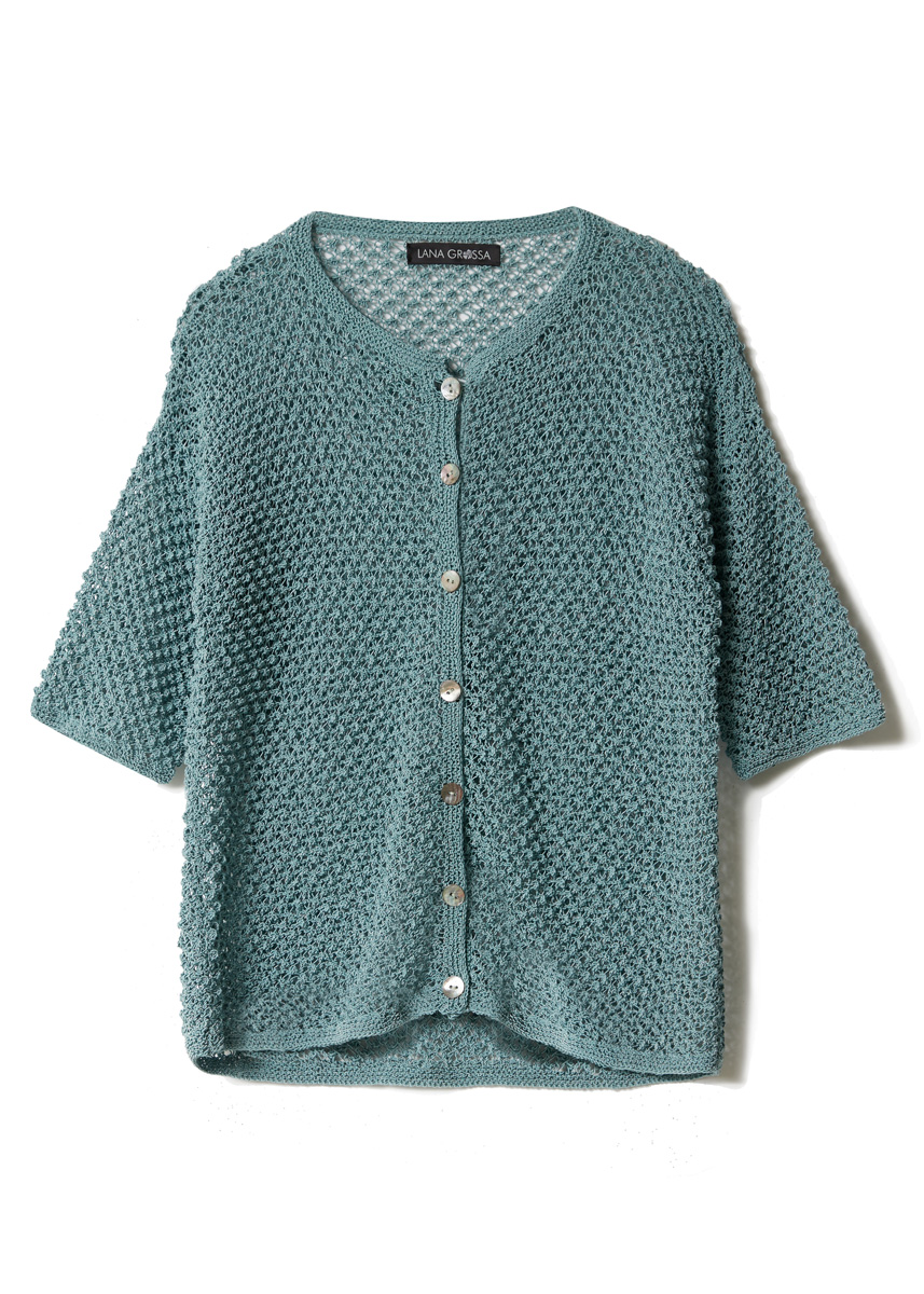 Lana Grossa „Capri“ (55% bomull, 30% polyamid, 15% siden, löplängd 150 m/50 g), 350 (400 – 450) g damastgrön (färg 45); stickor nr. 3 och 1 rundsticka nr. 3, 60 cm lång, 7 knappar från UNION KNOPF, Art. 37604, färg 12, Ø 14 mm.