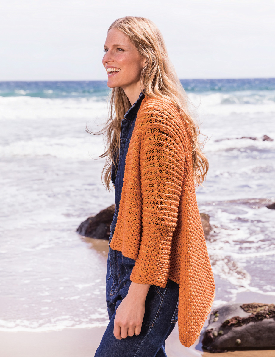 Lana Grossa-kvalitet „Cashseta” (40 % modal, 30 % polyamid, 15 % kashmir, 15 % silke, löplängd = ca. 100 m/50 g): ca. 200 (250 – 300) g orangebrun (färg 34) och Lana Grossa-kvalitet „Solo Lino” (80 % återvunnen lin (viskos), 20 % lin, löplängd = ca. 120 m/50 g): ca. 250 (300 – 350) g orange (färg 25); stickor nr. 7, 1 virknål nr. 6.