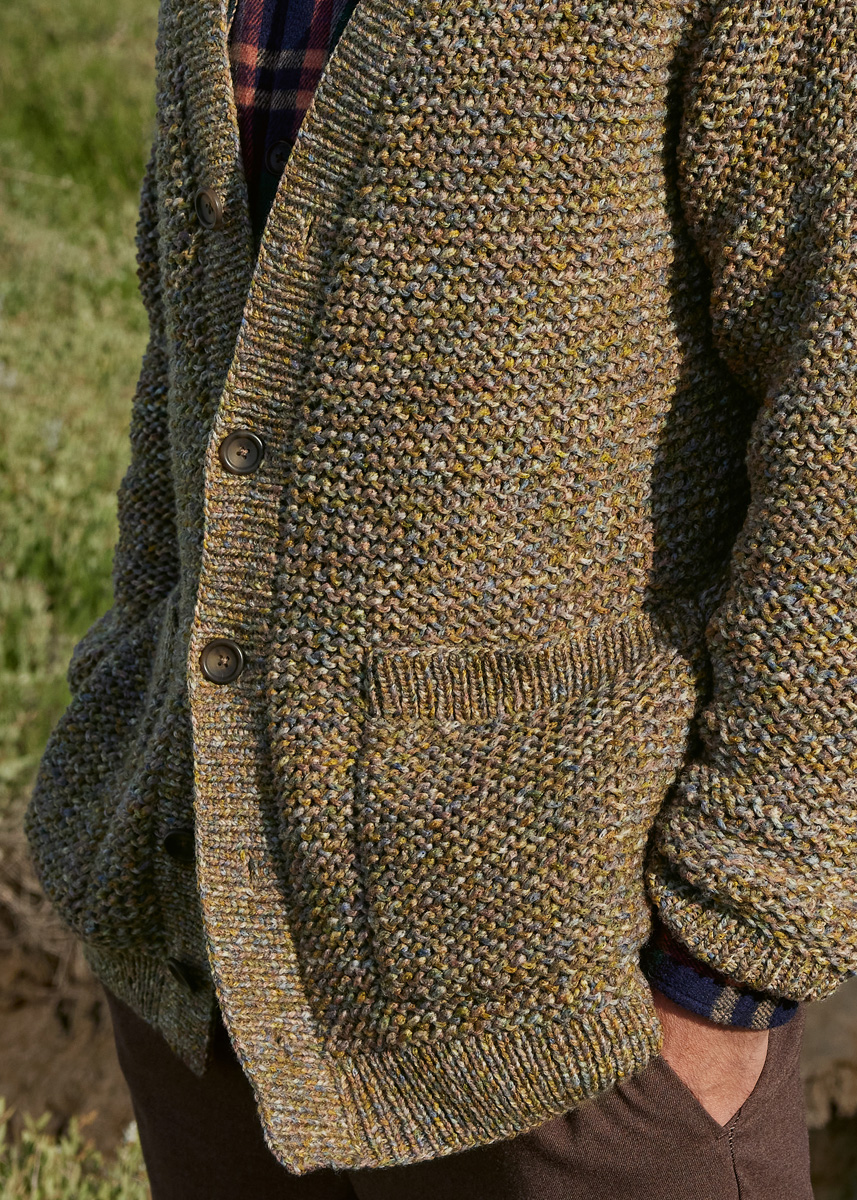Lana Grossa Cool Merino Print (90% ren ny ull (merino), 10% polyamid, löplängd 150 m/50 g), 850 (900 – 950) g senap/grå/beige/oliv/rosenträ (färg 110); stickor nr. 3,5 och 5,5, 1 rundsticka nr. 3, 80 cm lång och 5 knappar från UNION KNOPF, färg brun, Ø 20 mm.Lana Grossa Cool Merino Print (90% ren ny ull (merino), 10% polyamid, löplängd 150 m/50 g), 850 (900 – 950) g senap/grå/beige/oliv/rosenträ (färg 110); stickor nr. 3,5 och 5,5, 1 rundsticka nr. 3, 80 cm lång och 5 knappar från UNION KNOPF, färg brun, Ø 20 mm.