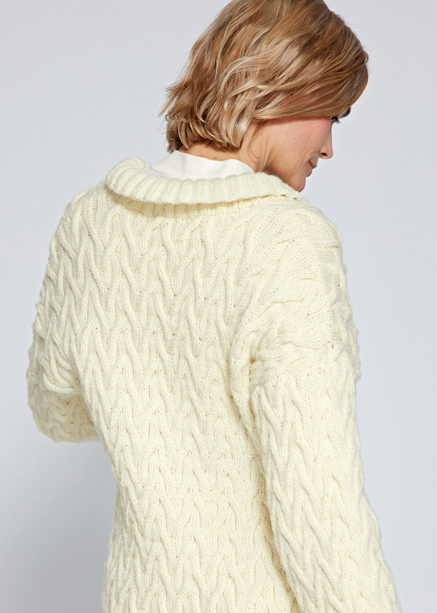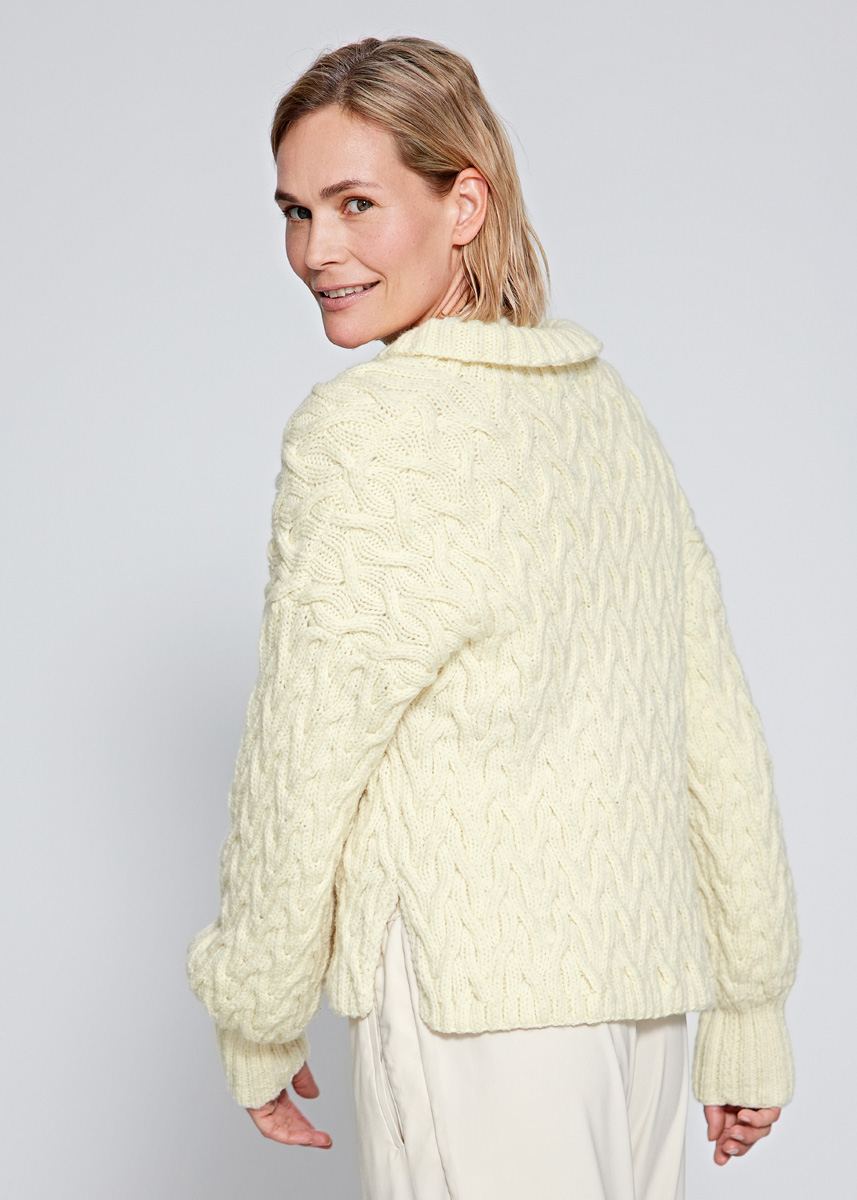 Lana Grossa Cool Merino (90% ren ny ull (merino), 10% polyamid, löplängd 150 m/50 g), 700 (750 – 800) g vit (färg 15); stickor nr. 4,5, 5 och 6, 1 rundsticka nr. 5,5, 40 cm lång, 1 hjälpsticka, 4 knappar från UNION KNOPF, färg vit, storlek 20 mm.
