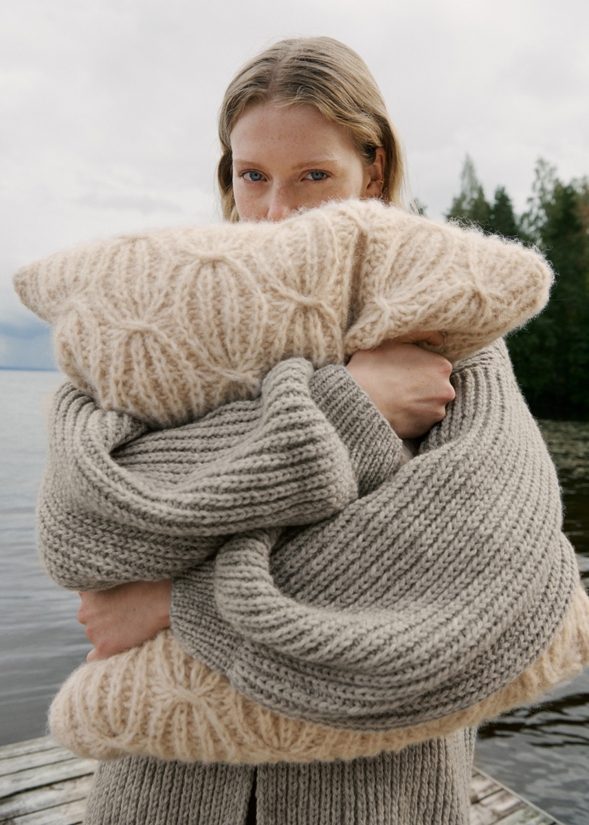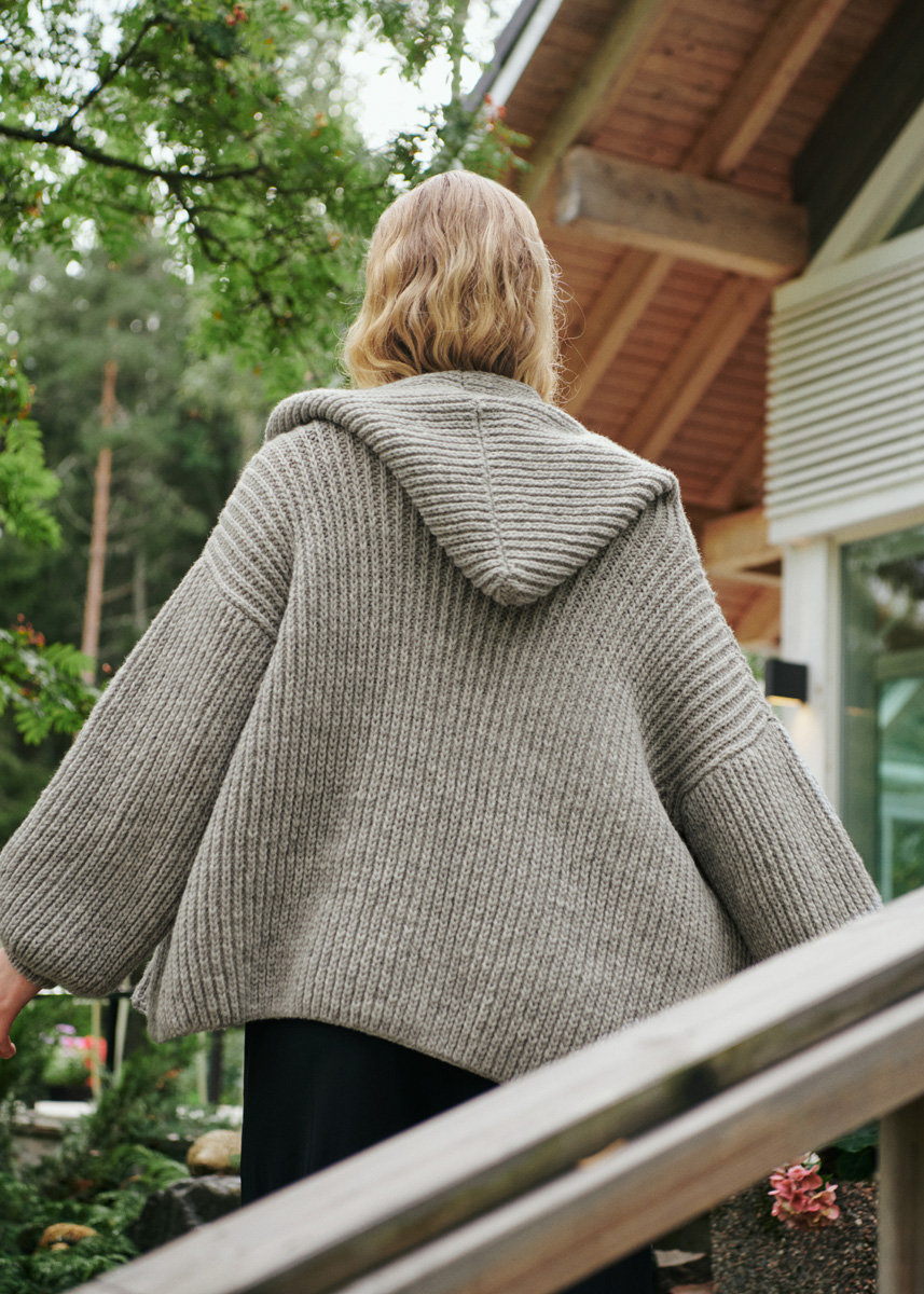 Lana Grossa-kvalitet „Cool Merino“ (90 % ren ny ull (merino), 10 % polyamid, löplängd = ca 150 m/50 g): ca 700 (750 - 800) g ljus grå (färg 13); stickor nr. 4 och 5; 1 rundsticka nr. 5; 1 maskmarkör.