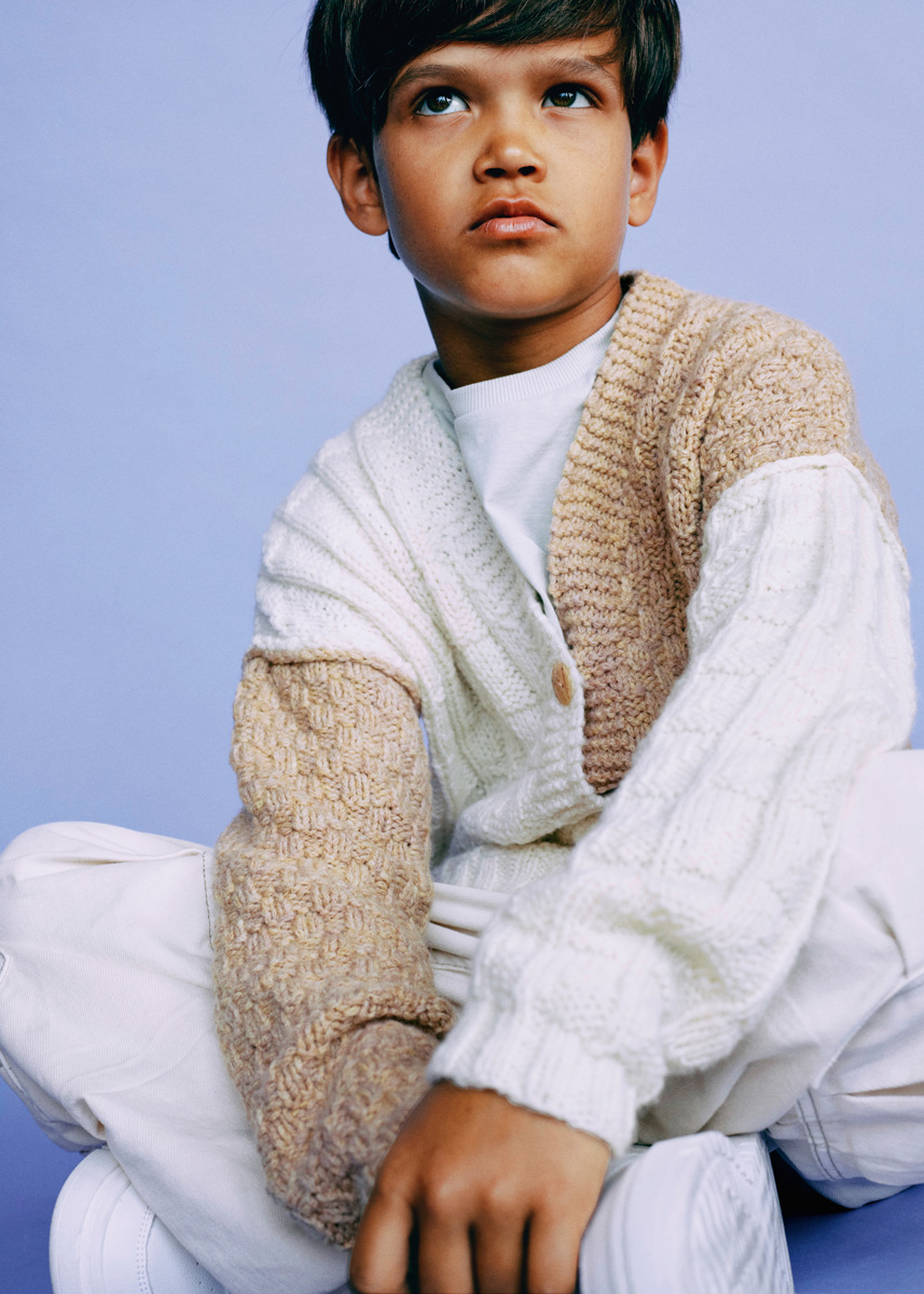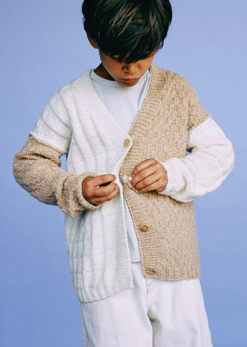 Lana Grossa Cool merino (90% ren ny ull (merino), 10% polyamid, löplängd 150 m/50 g), 150 (200 – 250) g vit (färg 15) och 150 (200 – 250) g ljusbeige (färg 23); stickor nr. 5 och 6, 1 rundsticka nr. 5, 80 cm lång, och 4 pärlemorknappar från UNION KNOPF, Art. 46286, färg 14, Ø 18 mm.