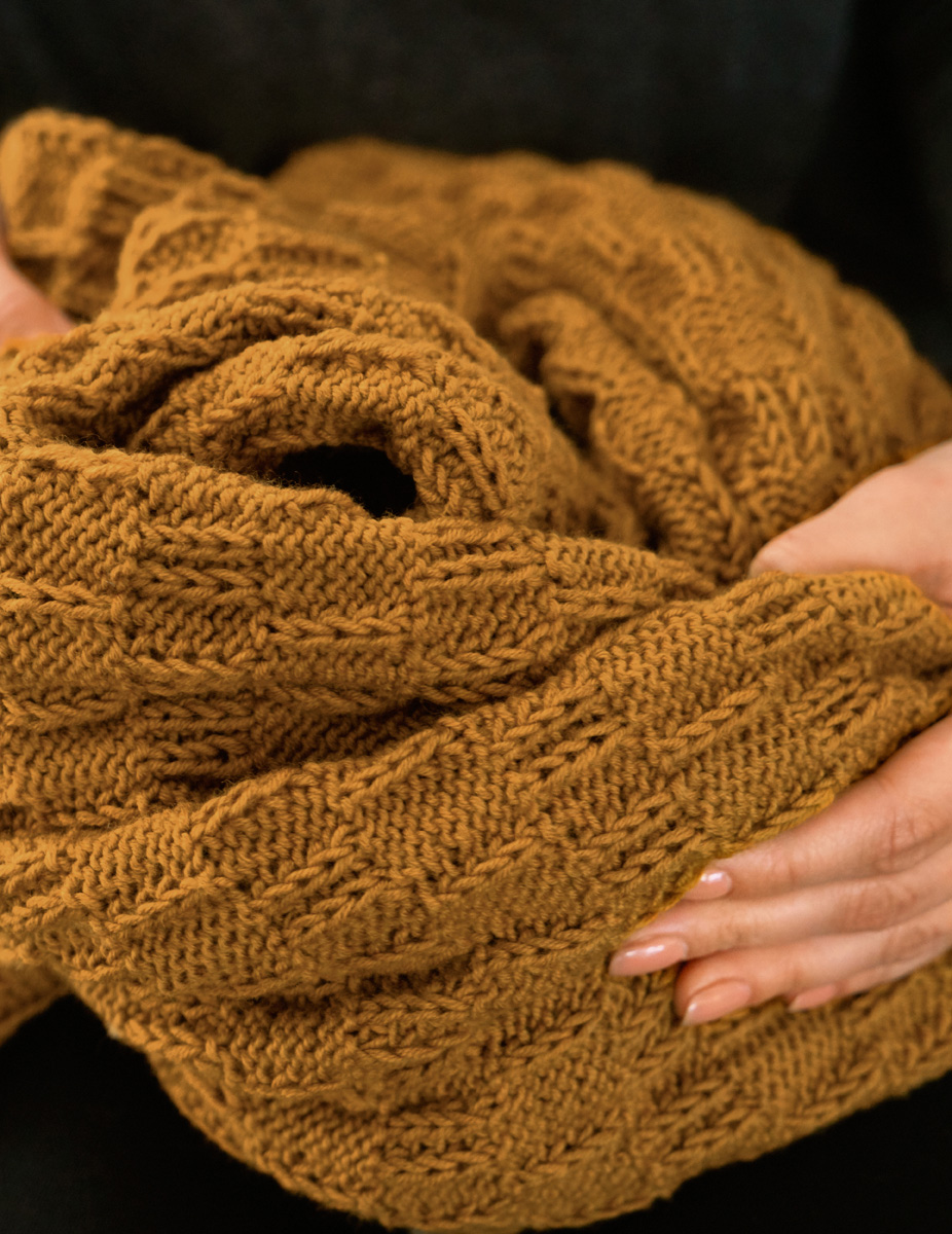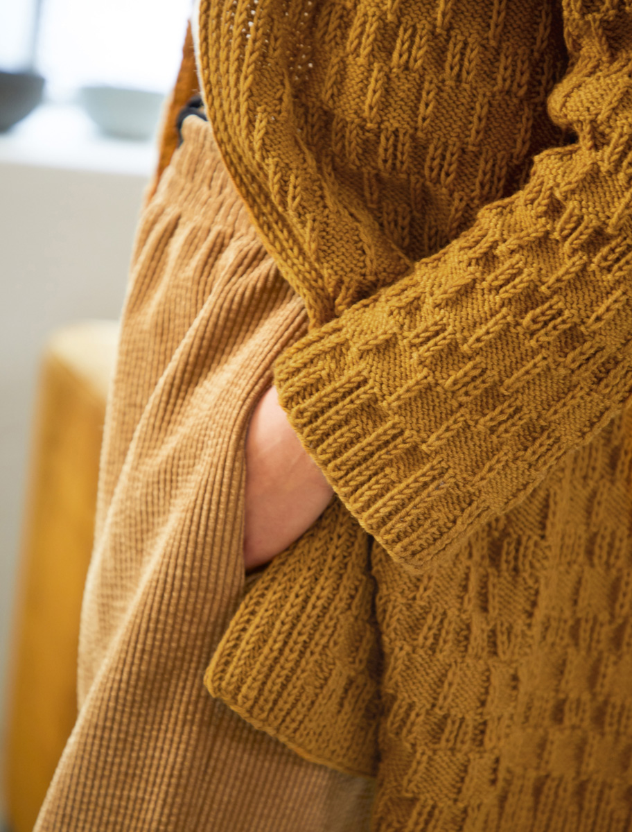 Lana Grossa-kvalitet „Cool Wool Big Mélange“ (100% virgin ull, löplängd ca. 120 m/50 g) ca. 700 (750 - 800 - 850) g bärnsten melerad (färg 343); stickor nr. 4,5