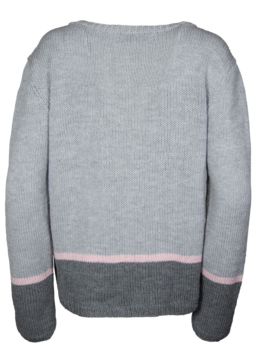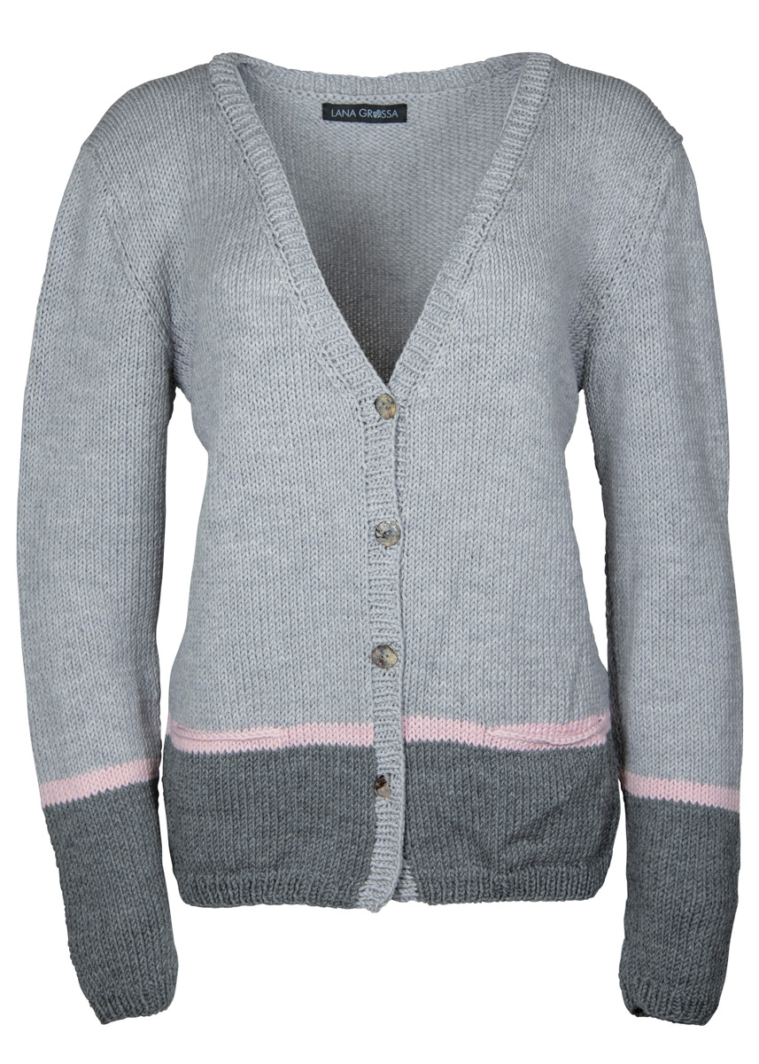 Lana Grossa Cool Wool Big mélange (100% ren ny ull, löplängd 120 m/50 g), 350 (400 – 450 – 500) g ljus grå melerad (färg 222), 100 (100 – 150 – 150) g mörk grå melerad (färg 221) och 50 g syrenrosa melerad (färg 217); stickor nr. 4, 5 och 5, 1 rundsticka nr. 4, 5, 100 cm lång, 4 knappar från UNION KNOPF, art. 37604, färg 12, st. 18 mm.