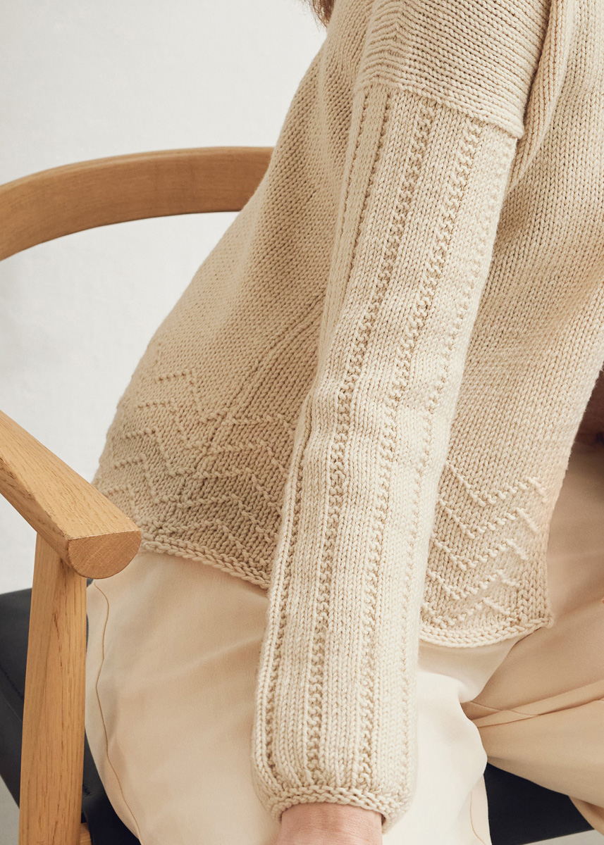 Lana Grossa-kvalitet „Cool Wool Big“ (100 % ren ny uld (ekstrafin merino), løbelængde = ca. 120 m / 50 gr.): 450(500-500-550-600) gr musling (fv 1016), Strikkepinde nr. 3½ og 4½, strømpepinde nr. 4½, hæklenål nr. 4