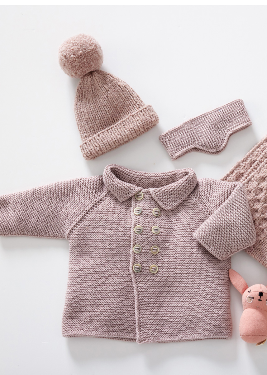 Lana Grossa-kvalitet ”Cool Wool Big” (100 % ren ny uld (ekstrafin merino), løbelængde = ca. 120 m / 50 gr.): 150(200-200-250) gr rosentræ (fv 953), rundpind nr. 4, stoppenål, 10 knapper 14 mm Ø.