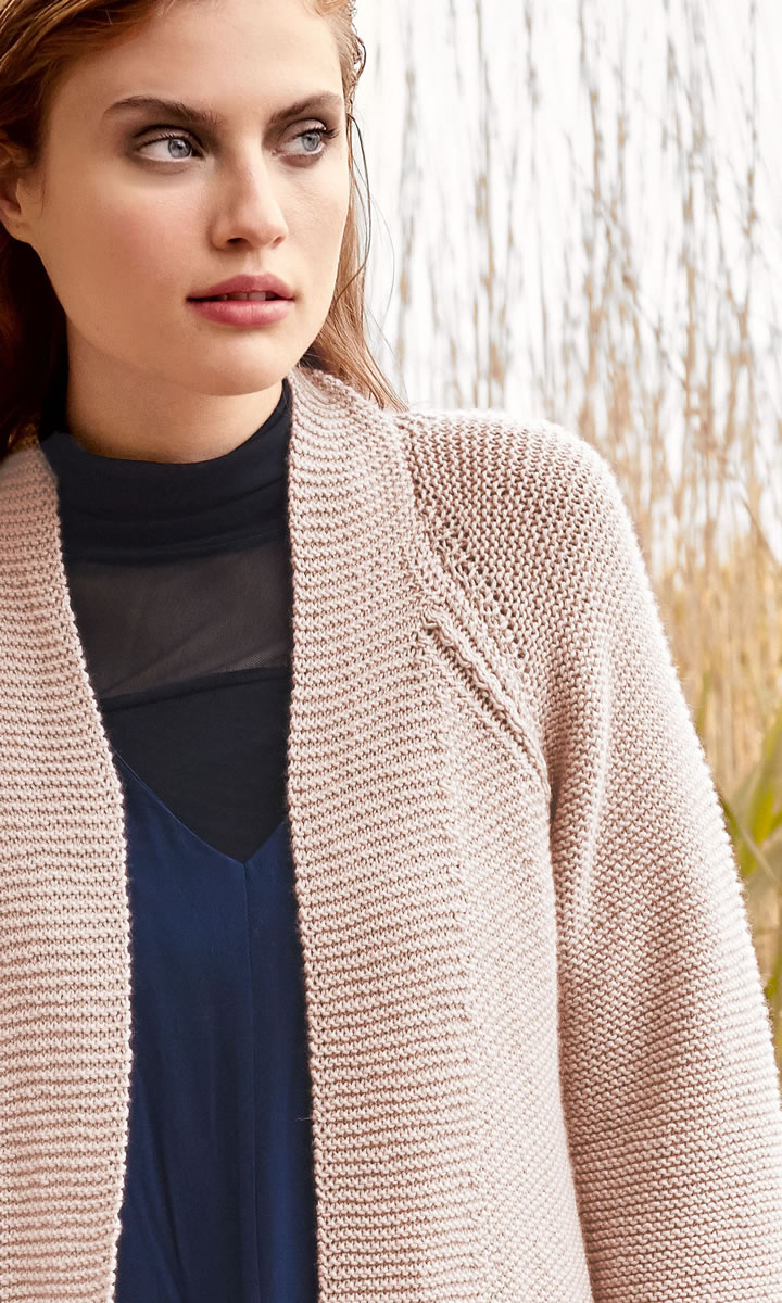Lana Grossa-kvalitet ”Cool Wool Cashmere” (90 % ren ny uld, 10 % cashmere, løbelængde = ca. 160 m / 50 gr.): ca. 700(750-800) gr. pudder (fv 17), strikkepinde nr. 3½.